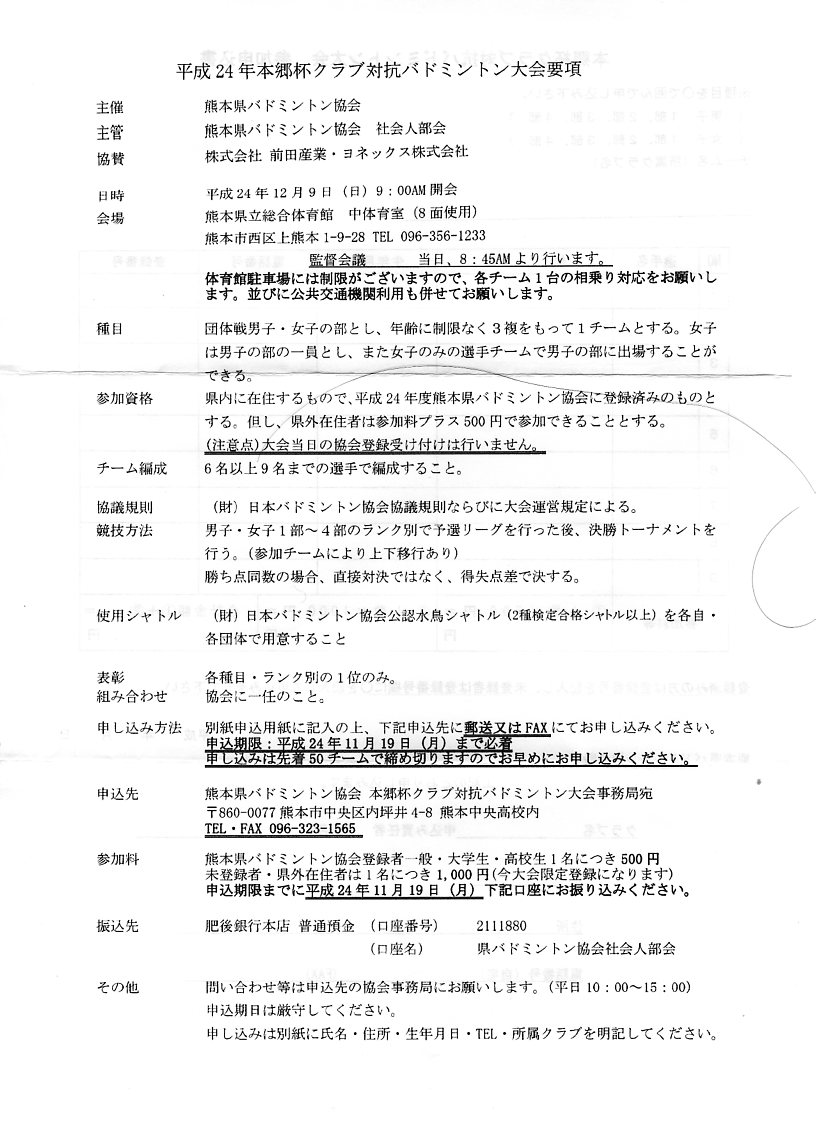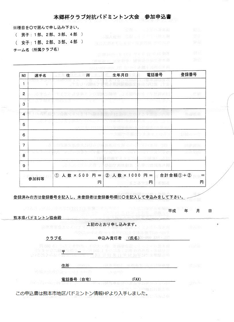 参加料:申し込み時に振り込み 県バドミントン協会登録者は1人500円 未登録者は申し込み時に登録する。登録料込みで1人1000円(大会当時の登録は不可)