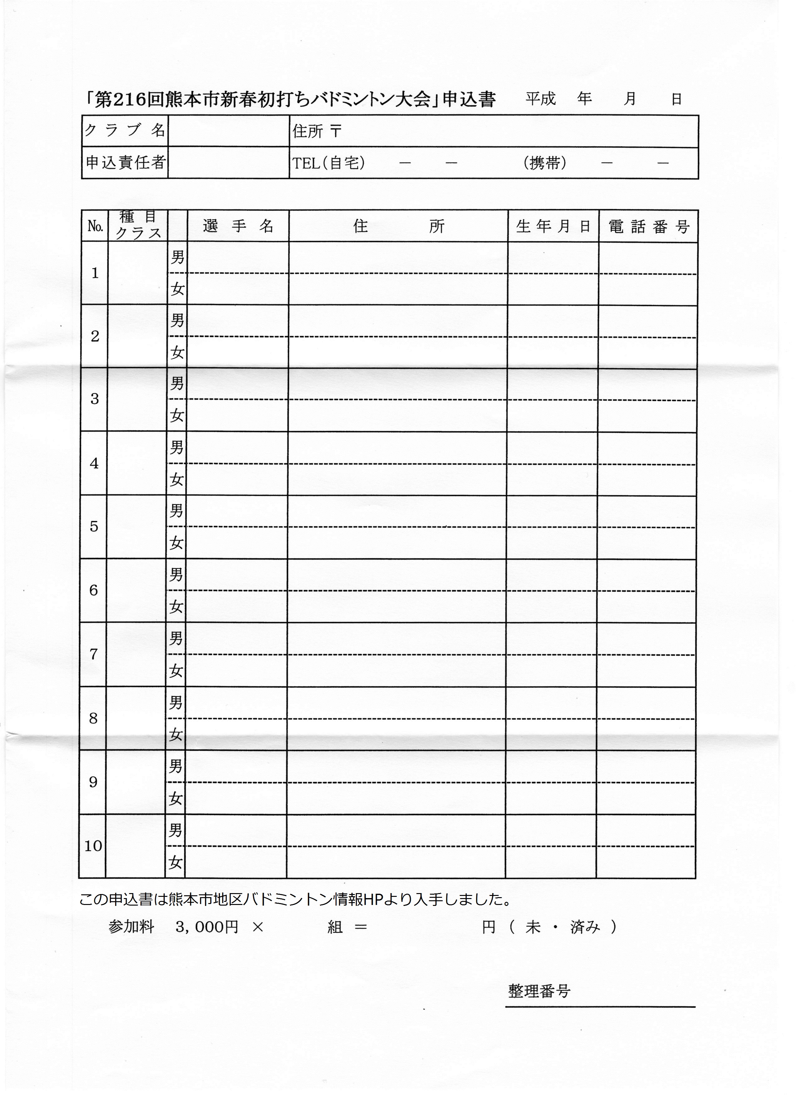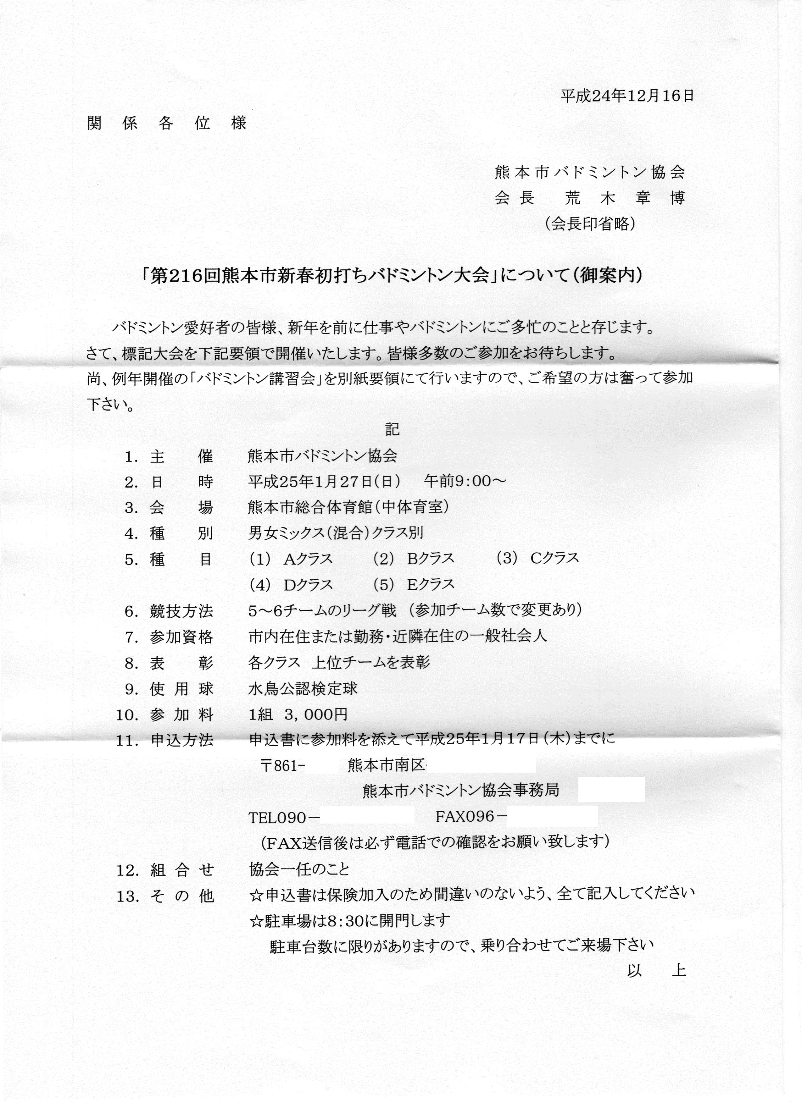 日時:平成25年1月27日(日) 9:00~会場:熊本市総合体育館 中体育室種別:男女ミックスダブルス クラス別種目:A,B.C.D,Eクラス競技方法:リーグ戦参加資格:熊本市内または近郊在住または勤務の方参加料:1組3000円締切:平成25年1月17日(木)その他:駐車場が少ないので乗り合わせをお願いします。 申し込み先:本HPのトップページの問い合わせボタンより、本HP管理人宛に問い合わせください。折り返し申し込み先を連絡いたします。