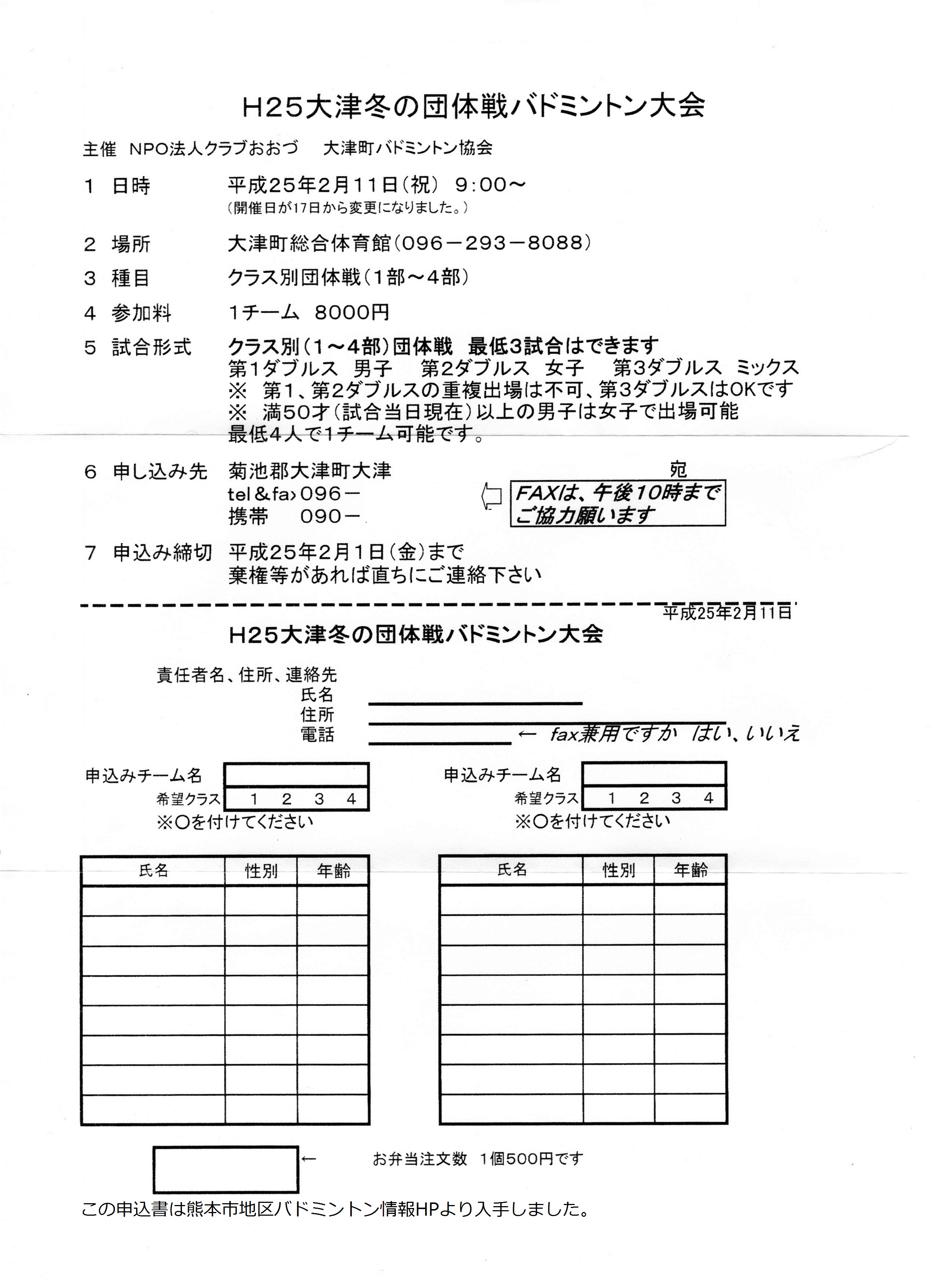 参加資格:チーム編成は自由(誰でも参加可) チームのランクを付けて申し込む。 1チーム4~6人(ミックスは男子または女子ダブルスと重複出場可)