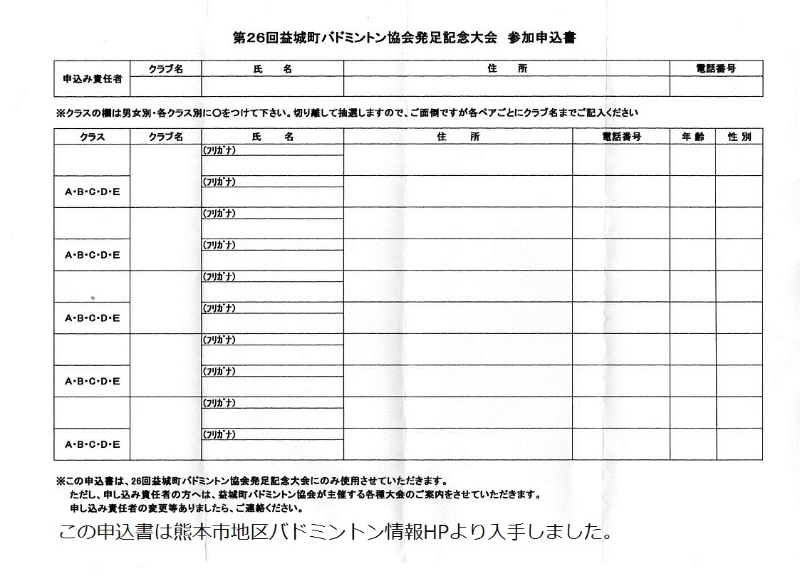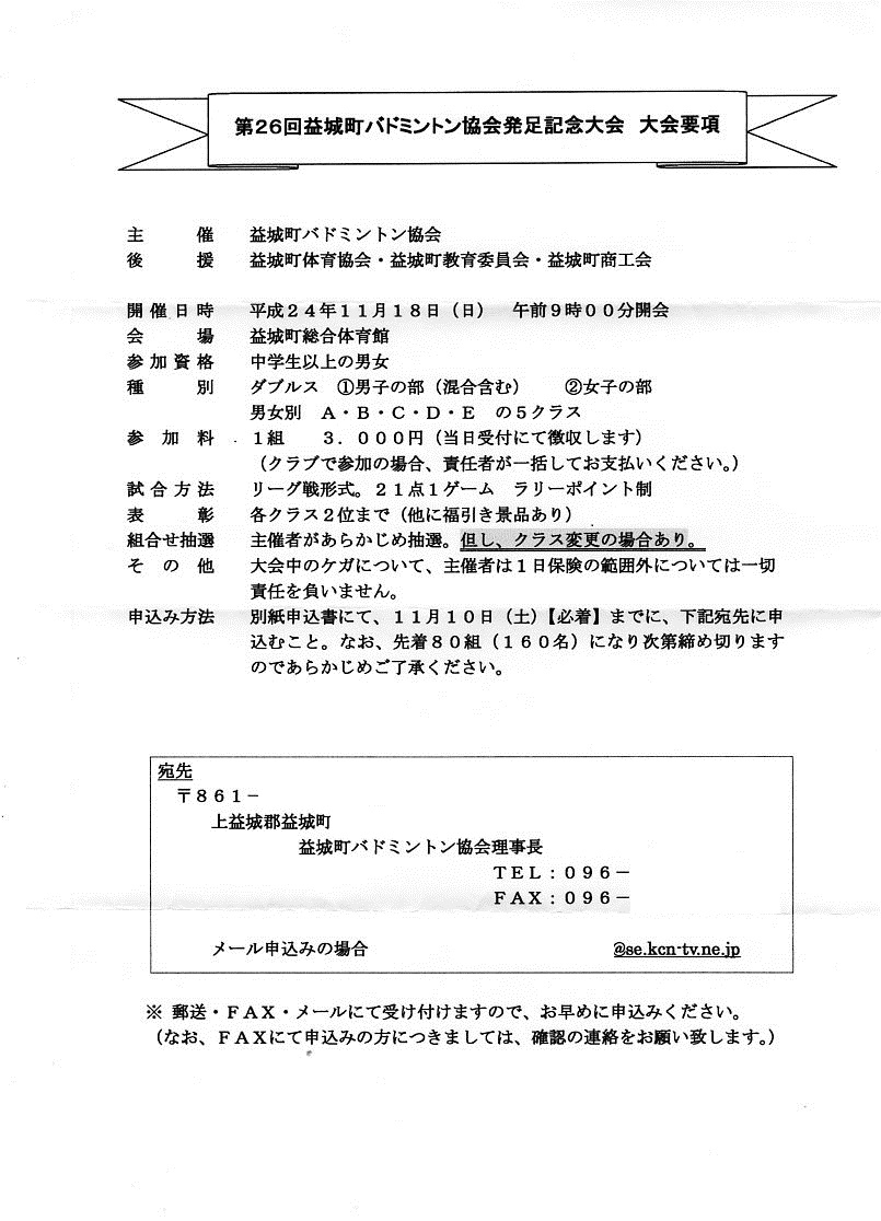 日時:平成24年11月18日(日) 9:00~会場:益城町総合体育館種別:男女別ランク別ダブルス個人戦種目:男女別 A・B・C・D・Eクラス 混合は男子の部に参加可参加資格:中学生以上競技方法:リーグ戦 21点ラリーポイント制 参加料:1組3000円 福引き景品あり締め切り:平成24年11月10日(土) 先着80組で締め切り申込先:本HPトップページの問い合わせボタンから本HP管理人宛に問い合わせ下さい。折り返し申込先を連絡致します。