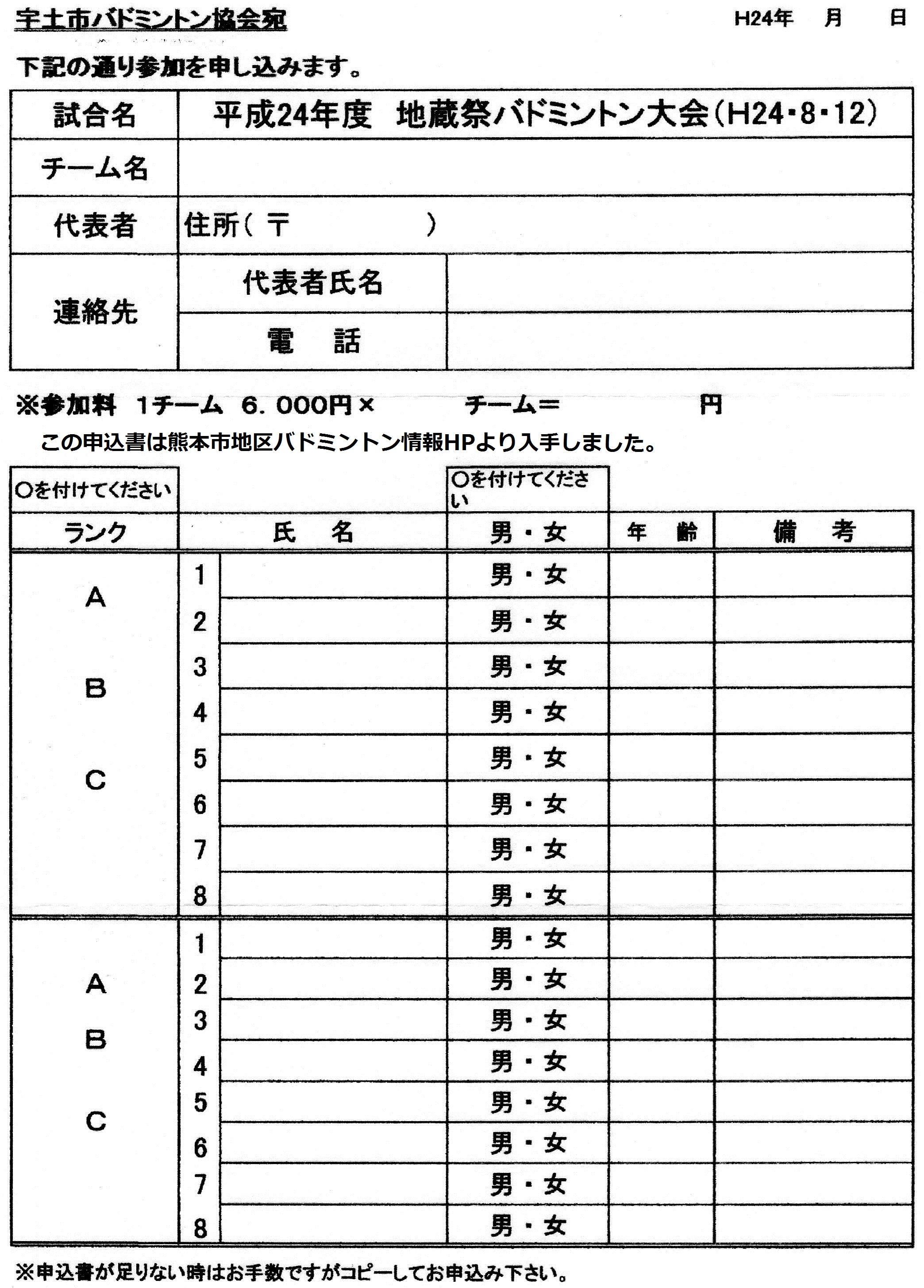 種目:男子ダブルス2 女子ダブルス1 の3ダブルス団体戦 (重複参加はできません 6名以上必要。補欠をいれて8名まで)