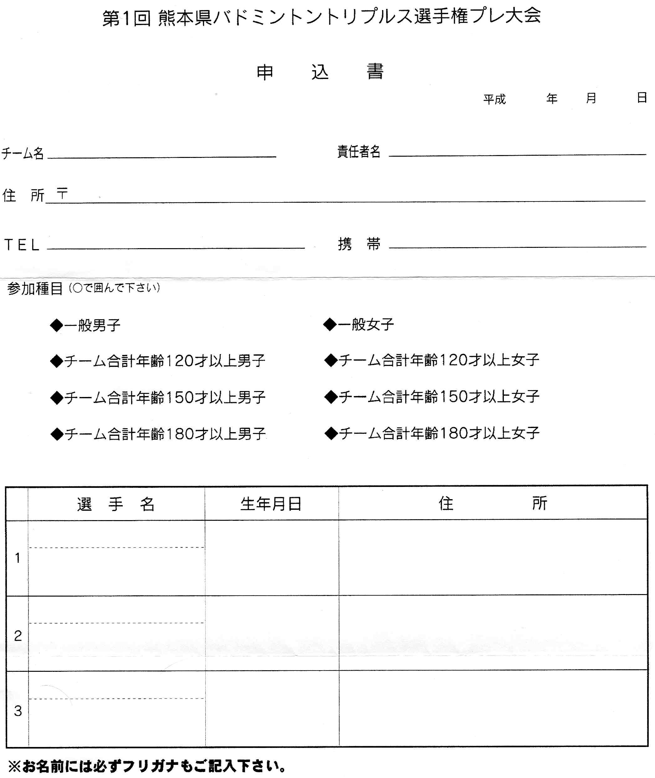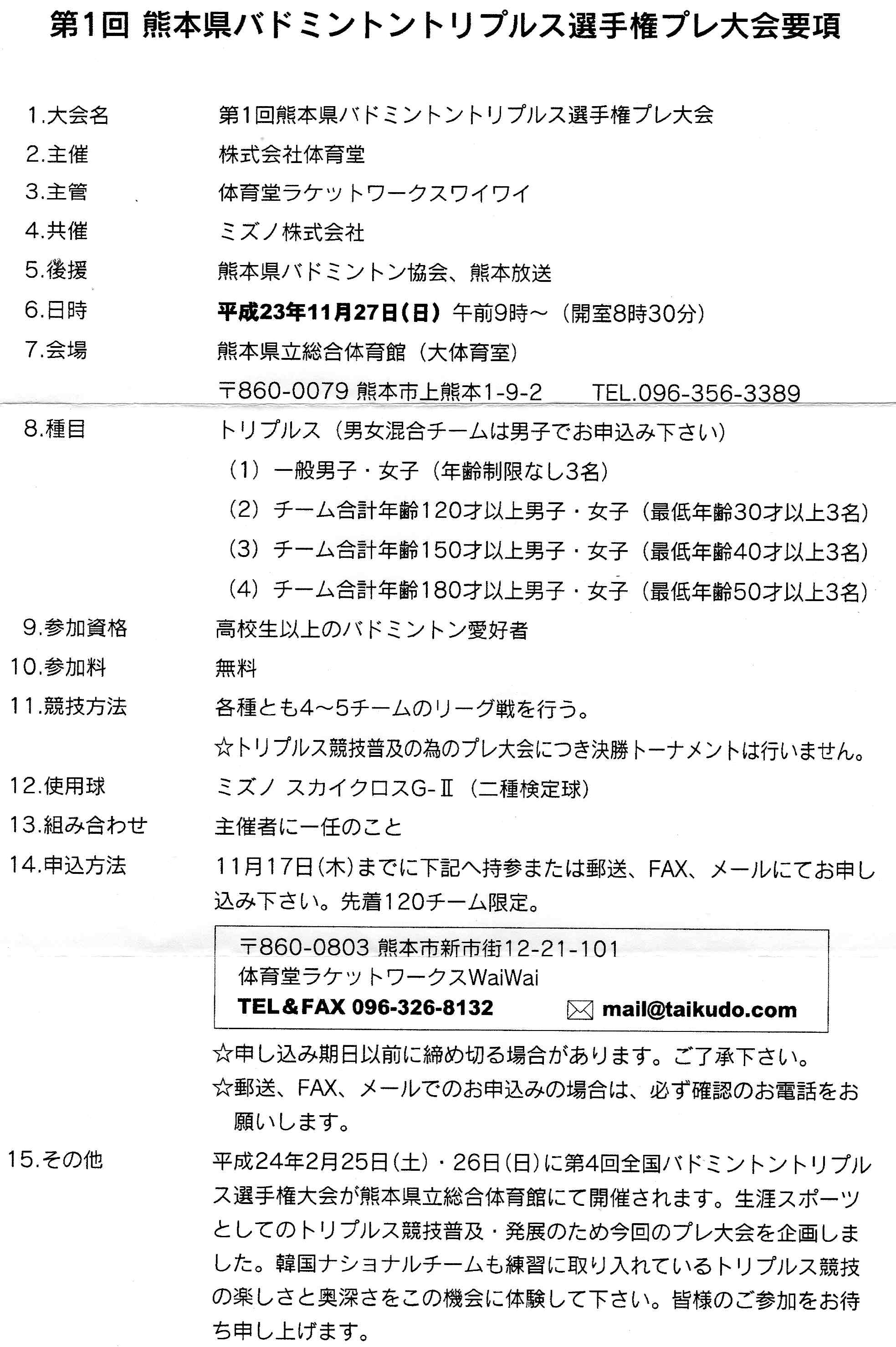平成24年2月25日(日)、26日(日)に熊本県立総合体育館にて開催される第4回全国バドミントントリプルス選手権大会のプレ大会だそうです。