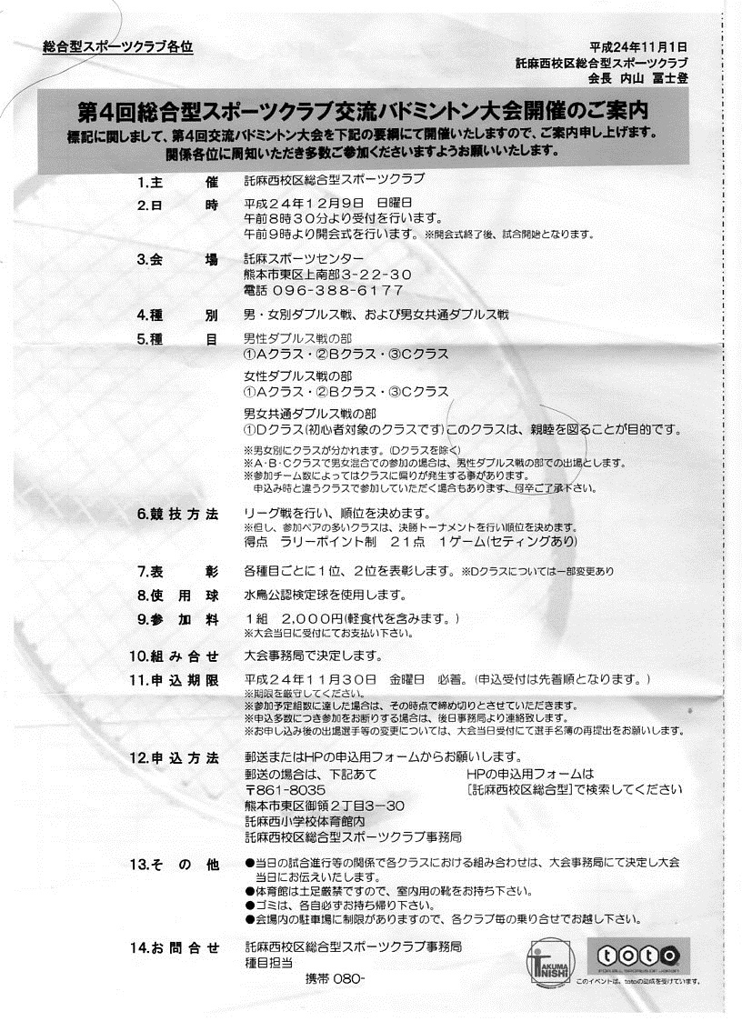 申込先:託麻西校区総合型スポーツクラブ事務局(郵送の場合:添付の大会要項に記載されている住所 HPの場合:http://takumanishihp.kumamoto-webtown.net/a0002/MyHp/Pub/ に申し込み用フォームがあります