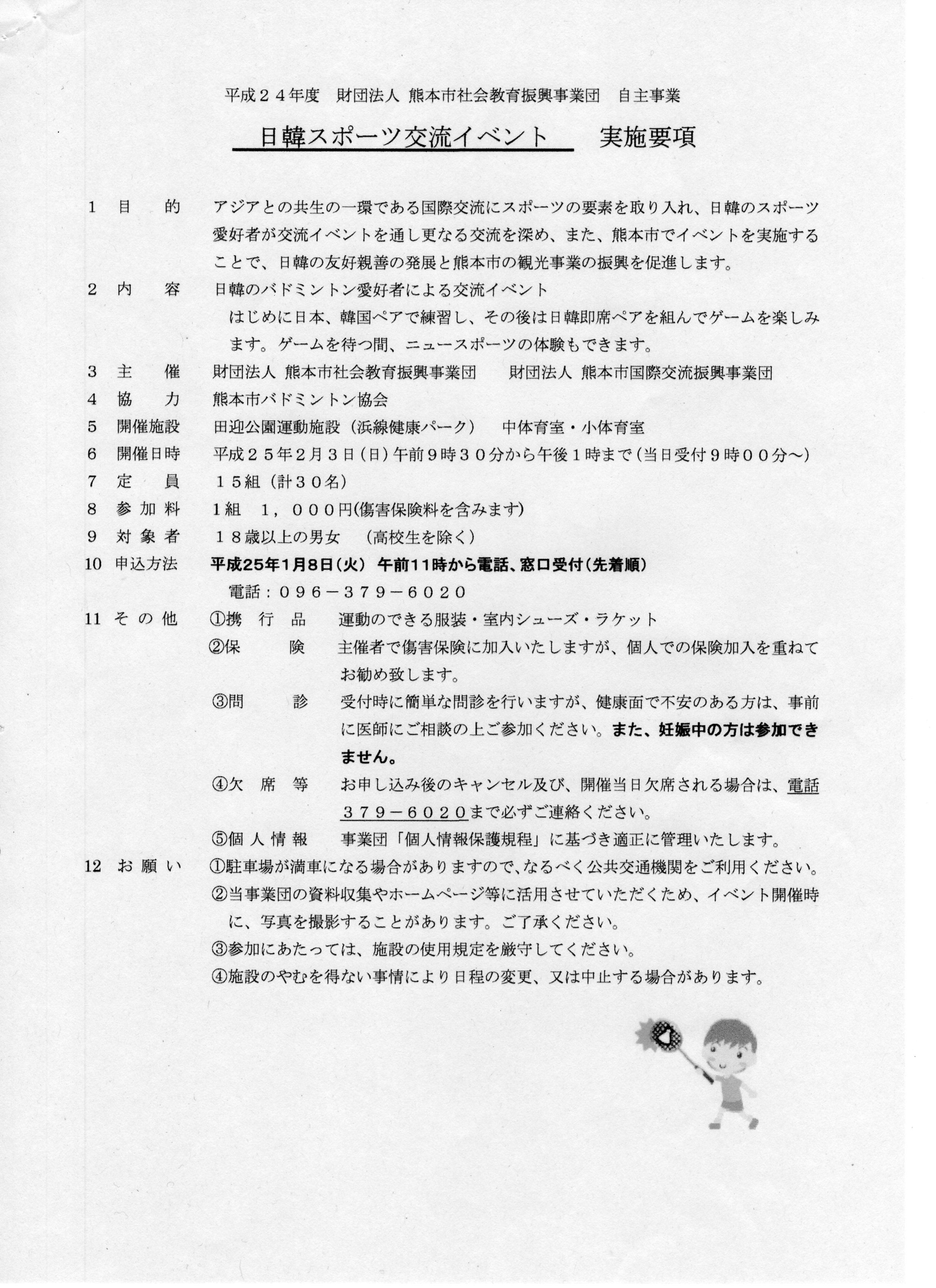 日時:平成25年2月3日(日) 9:00~受付会場:浜線健康パーク 中体育室主催:財団法人 熊本市社会教育振興事業団、 財団法人 熊本市国際交流振興事業団定員:15組(計30名)参加料:1組1000円(傷害保険込み)対象者:18歳以上(高校生除く)申込先:浜線健康パーク窓口 or電話受付 096-379-6020内容:はじめに日本、韓国ペアで練習し、その後は日韓即席ペアを組んでゲームを楽しみます。ゲームを待つ間にニュースポーツの体験もできます。