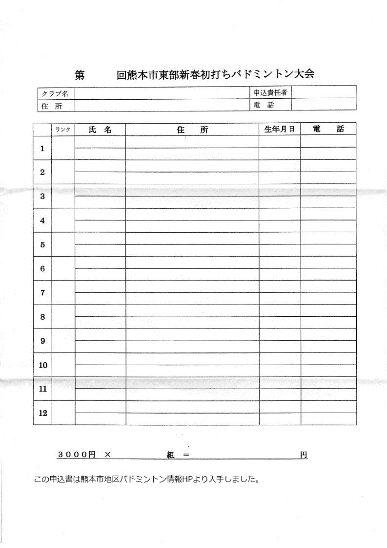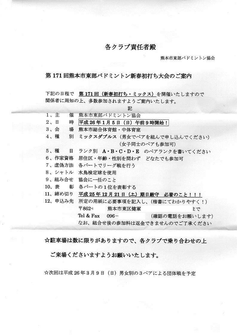 日時:平成26年1月5日(日) 9:00~会場:熊本市総合体育館 中体育室種別:男女ミックスダブルス クラス別種目:A,B.C.D,Eクラス競技方法:リーグ戦参加料:1チーム3000円(福引あり)締切:平成25年12月21日(土)その他:駐車場が少ないので乗り合わせをお願いします。昨年からペアを組んで申し込みに変わっていますのでご注意ください。申し込み先:本HPのトップページの問い合わせボタンより、本HP管理人宛に問い合わせください。折り返し申し込み先を連絡いたします。