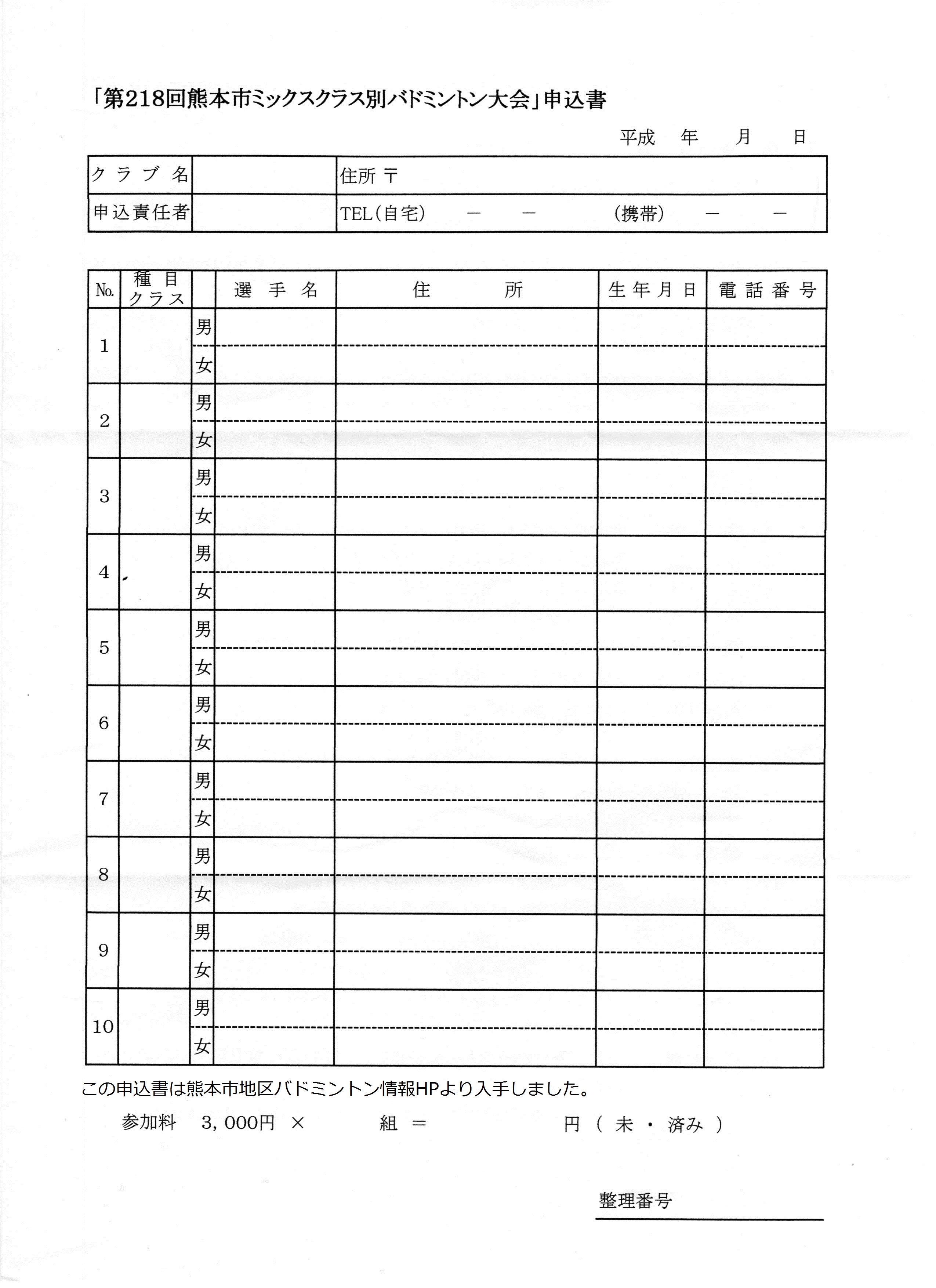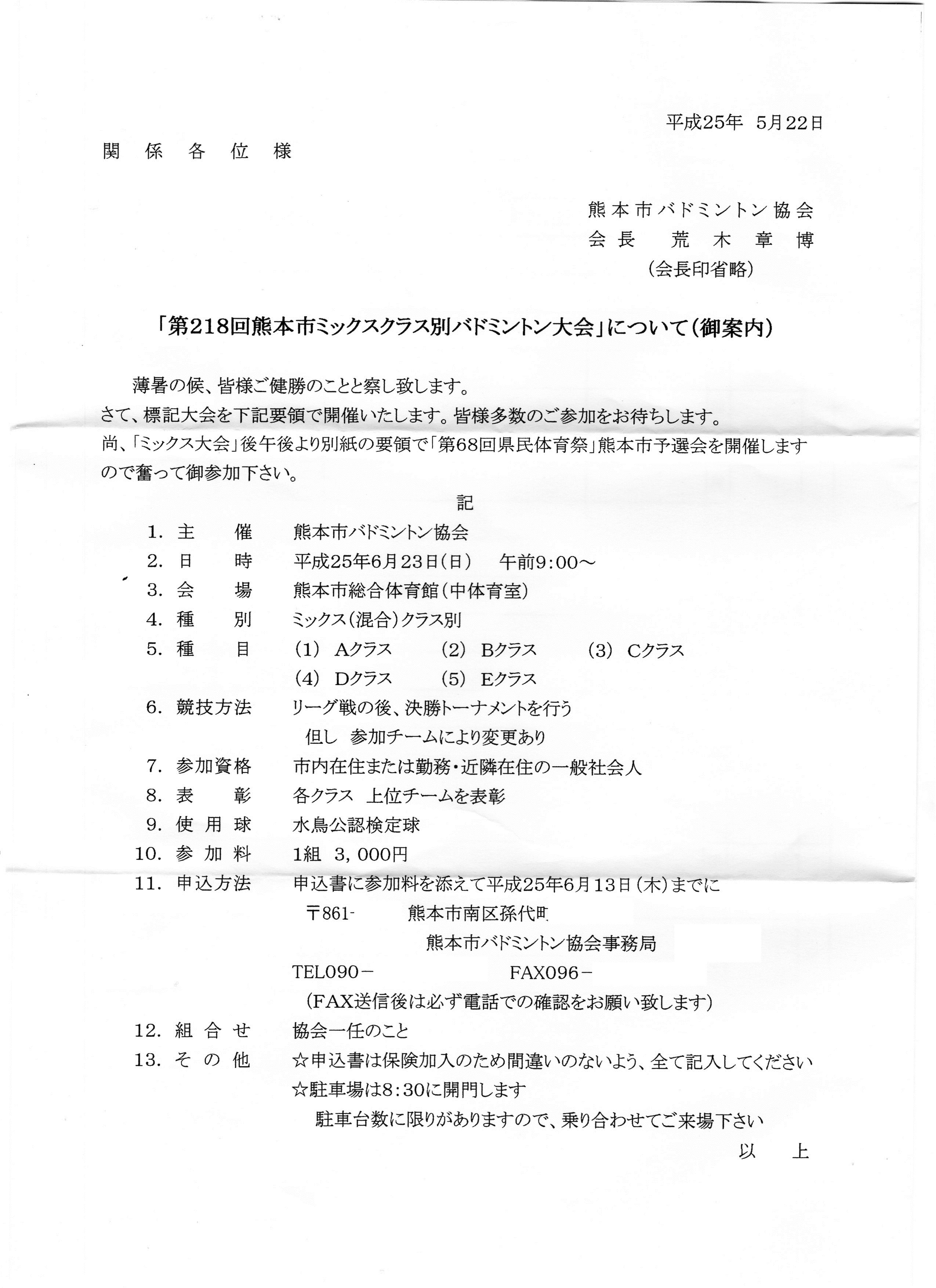 日時:平成25年6月23日(日) 9:00~会場:熊本市総合体育館 中体育室種別:ミックスダブルス個人戦(A,B,C,D,E)種目:クラス別競技方法:リーグ戦参加資格:市内又は市内周辺在住・勤務の方参加料:1チーム3000円 締め切り:平成25年6月13日(木)必着申込先:本HPトップページの問い合わせボタンより本HP管理人宛に問い合わせ下さい。折り返し申込先を連絡致します。