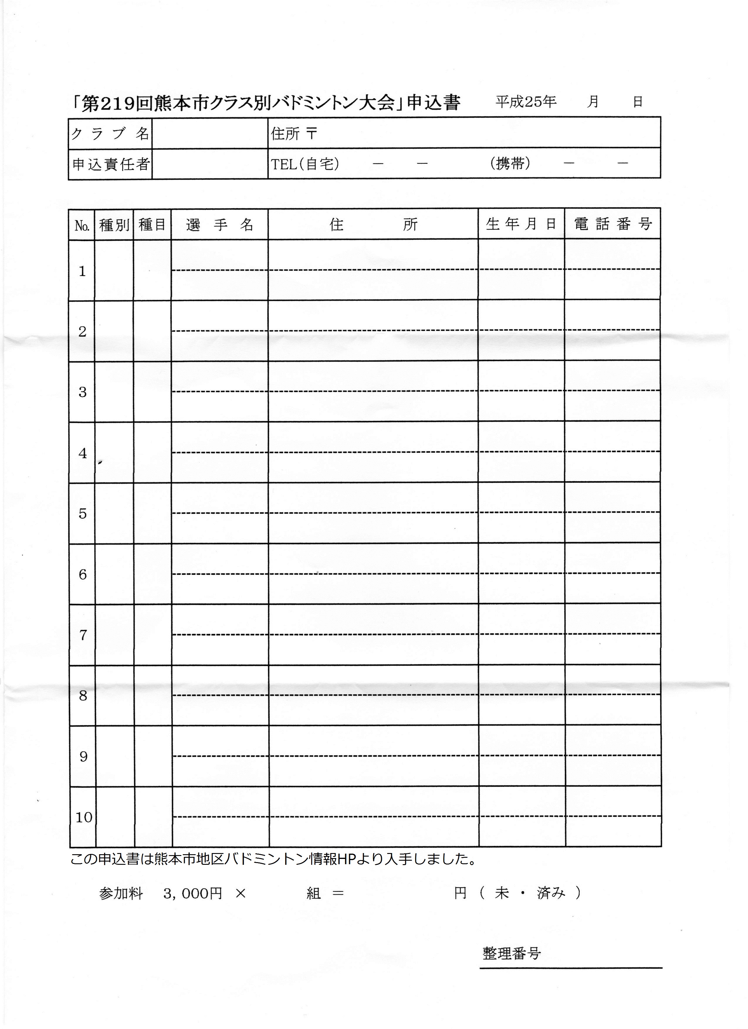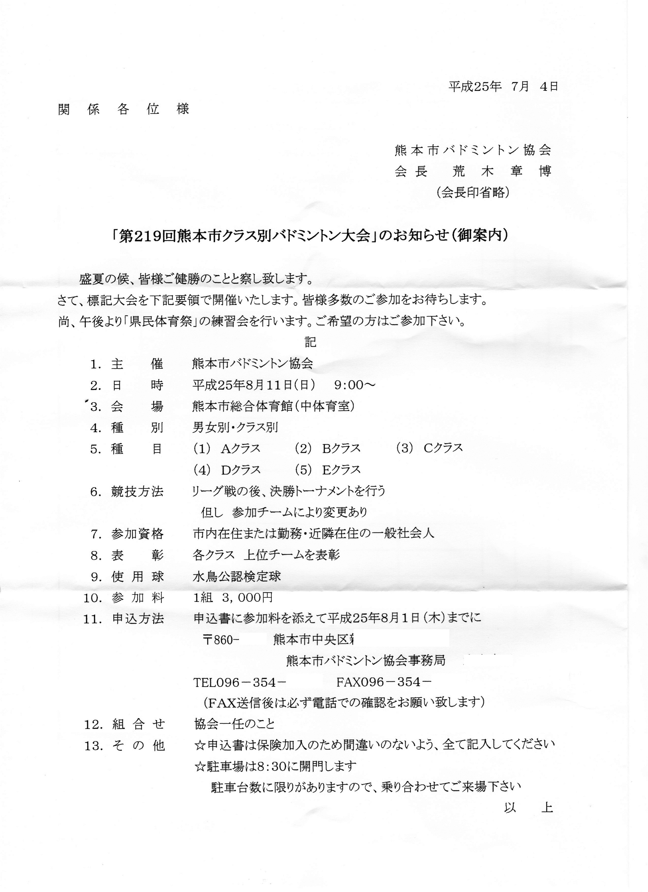日時:平成25年8月11日(日) 9:00~会場:熊本市総合体育館 中体育室種別:男女別ダブルス個人戦 男子(A,B,C,D,E) 女子(A,B,C,D,E)種目:男女別 クラス別競技方法:リーグ戦参加資格:市内在住・勤務、又は市内周辺在住の方参加料:1チーム3000円 締め切り:平成25年8月1日(木)必着申込先:本HPトップページの問い合わせボタンより本HP管理人宛に問い合わせ下さい。折り返し申込先を連絡致します。