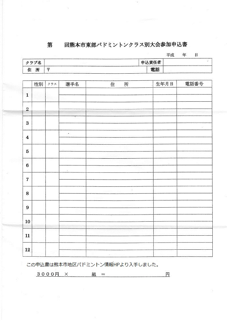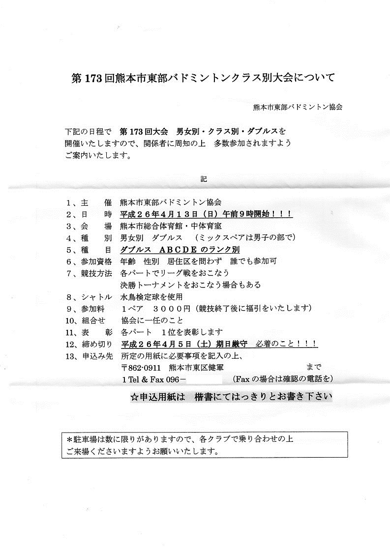 日時:平成26年4月13日(日) 9:00~会場:熊本市総合体育館 中体育室種別:男女別ダブルス個人戦種目:男女別 クラス(A,B,C,D,E)別参加資格:誰でも可 年齢、居住区を問わない。競技方法:リーグ戦表彰:優勝チームを表彰。参加料:1チーム3000円 (福引き有り)締め切り:平成26年4月5日(土)必着申込先:本HPトップページの問い合わせボタンより本HP管理人宛に問い合わせ下さい。折り返し申込先を連絡致します。