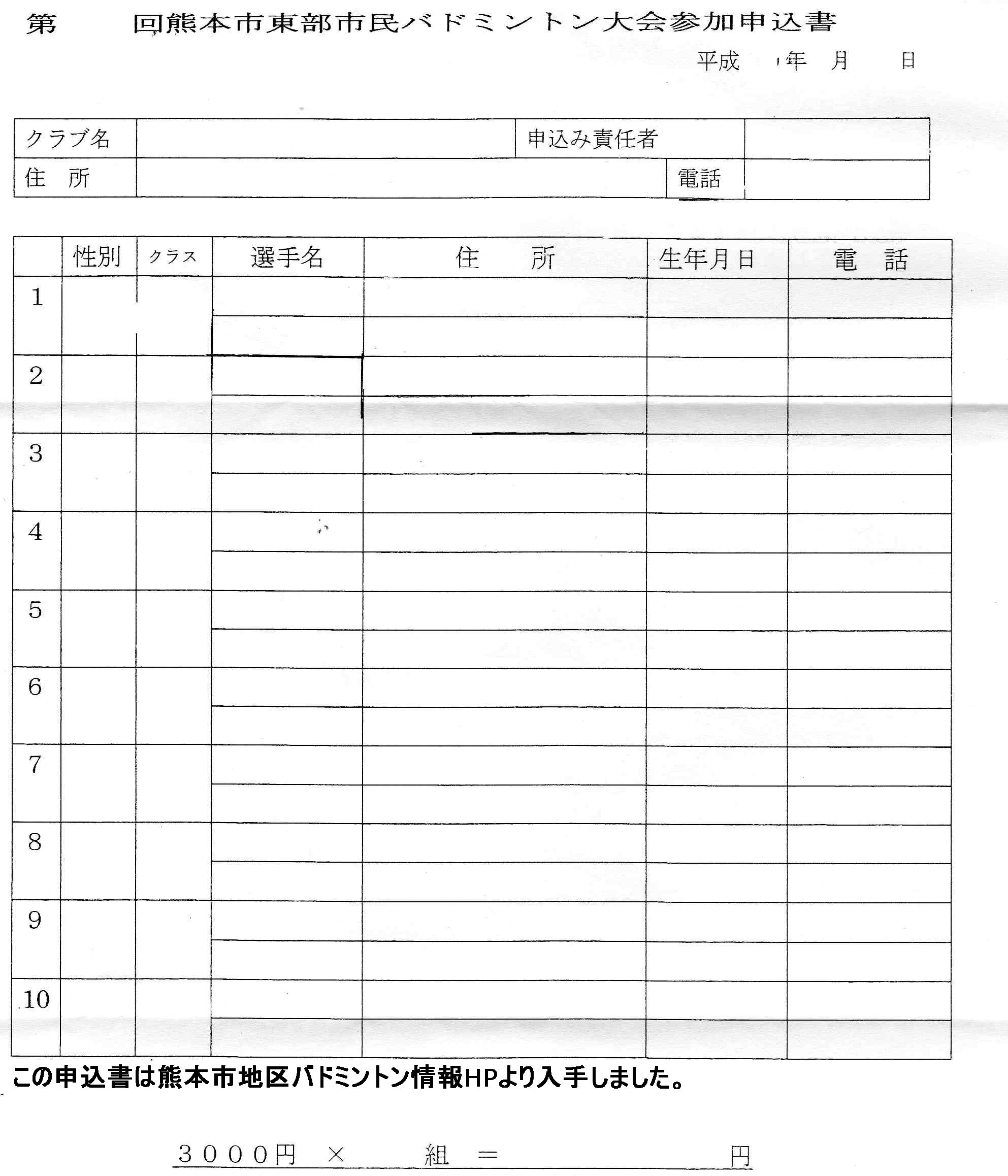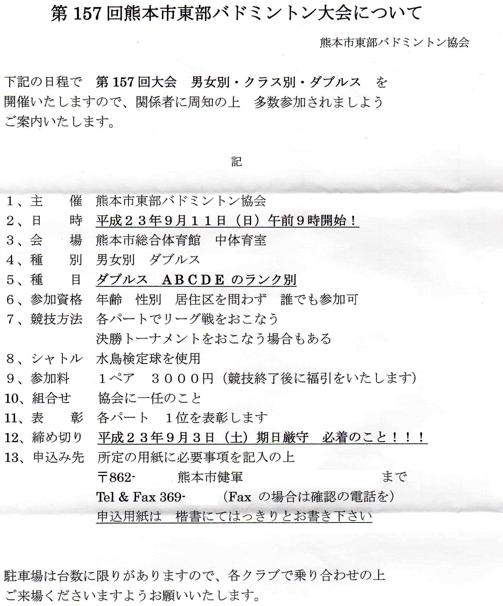 日時:平成23年9月11日(日) 9:00~会場:熊本市総合体育館 中体育室種別:男女別ダブルス個人戦種目:男女別 クラス(A,B,C,D,E)別参加資格:誰でも可 年齢、居住区を問わない。競技方法:リーグ戦表彰:優勝チームを表彰。参加料:1チーム3000円 (福引き有り)締め切り:平成23年9月3日(土)必着申込先:本HPトップページの問い合わせボタンより本HP管理人宛に問い合わせ下さい。折り返し申込先を連絡致します。