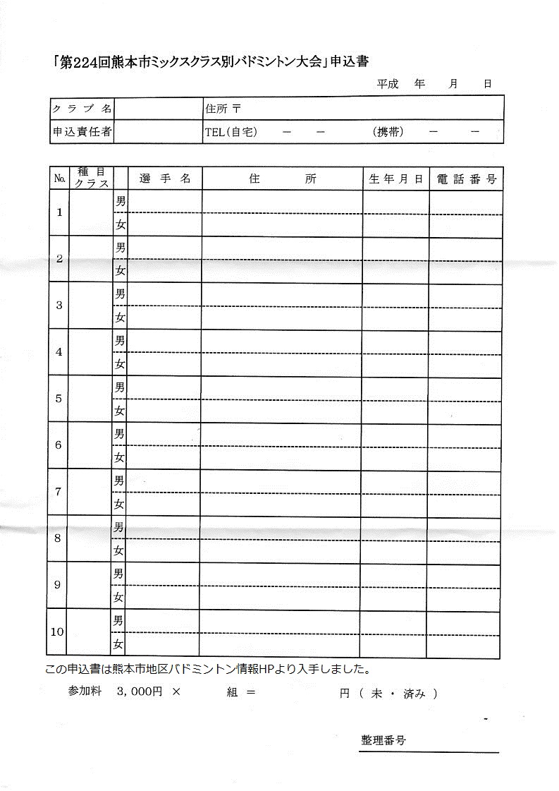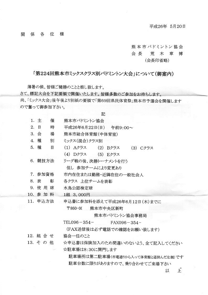 日時:平成26年6月22日(日) 9:00~会場:熊本市総合体育館 中体育室種別:ミックスダブルス個人戦(A,B,C,D,E)種目:クラス別競技方法:リーグ戦参加資格:市内又は市内周辺在住・勤務の方参加料:1チーム3000円 締め切り:平成26年6月12日(木)必着申込先:本HPトップページの問い合わせボタンより本HP管理人宛に問い合わせ下さい。折り返し申込先を連絡致します。