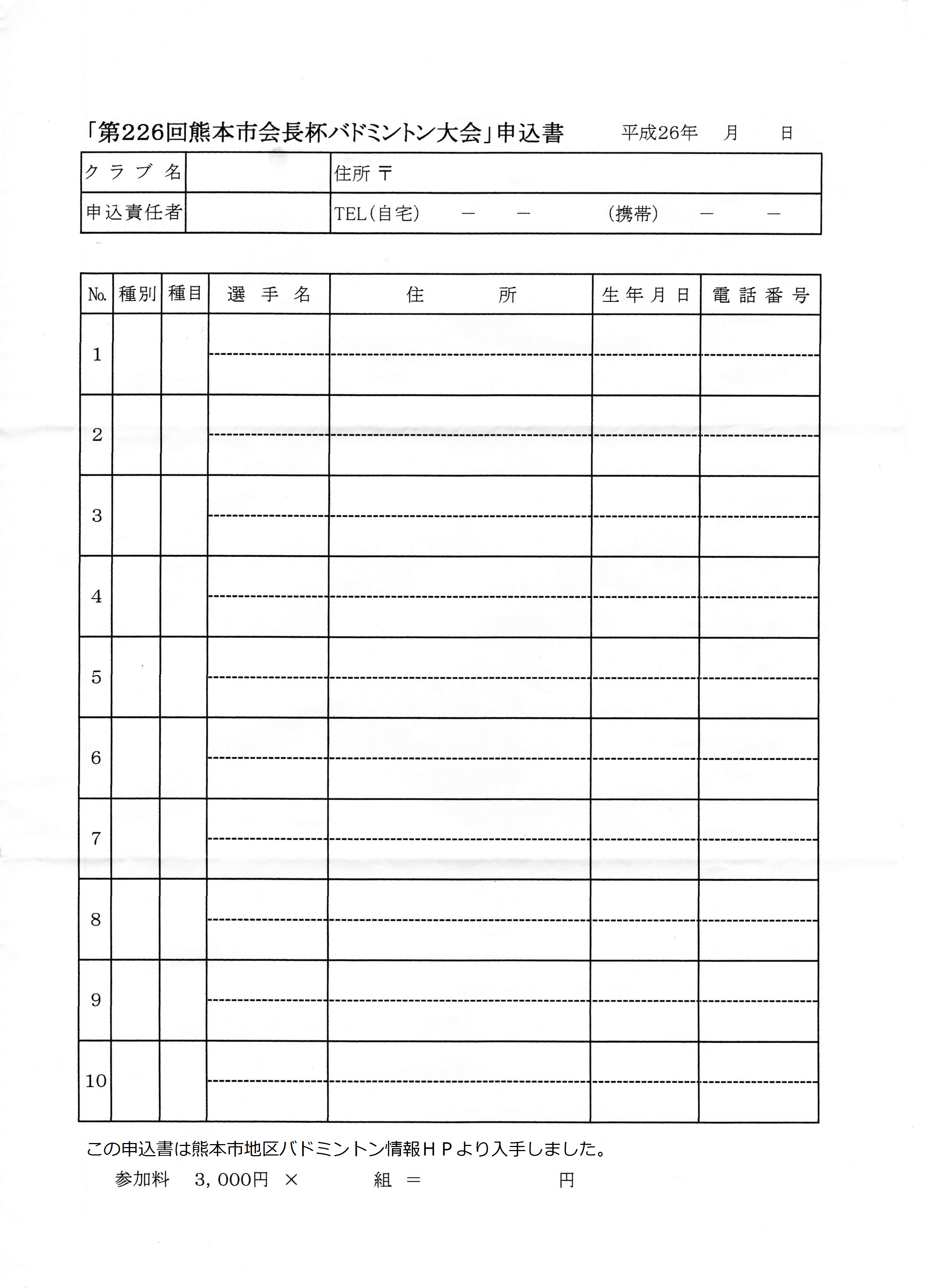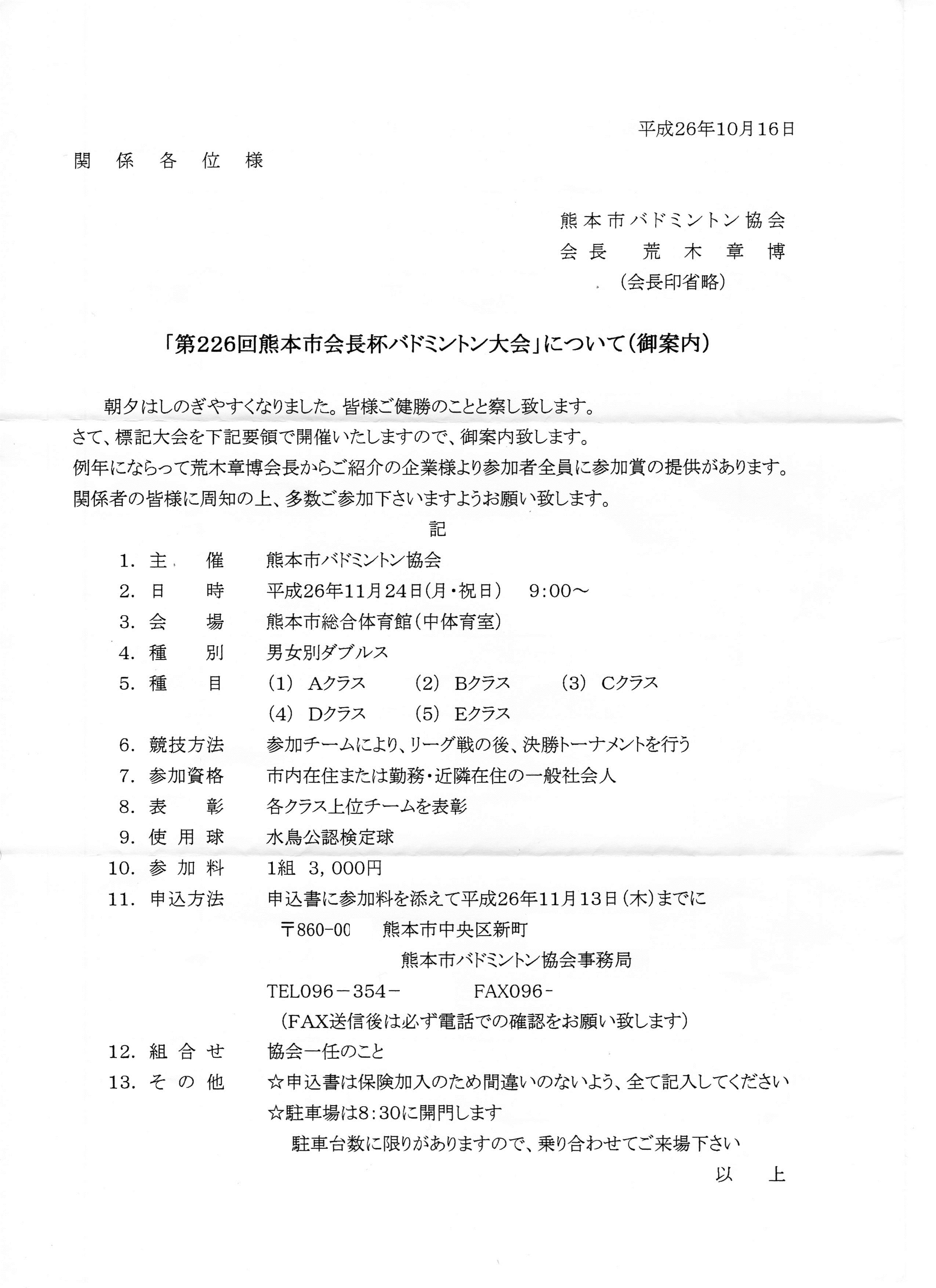 日時:平成26年11月24日(月 祝日) 9:00~会場:熊本市総合体育館 中体育室種別:男女別ダブルス個人戦 男子(A,B,C,D,E) 女子(A,B,C,D,E)種目:男女別 クラス別競技方法:リーグ戦参加資格:市内又は市内近隣在住・勤務の一般社会人参加料:1チーム3000円 締め切り:平成26年11月13日(木)必着申込先:本HPトップページの問い合わせボタンより本HP管理人宛に問い合わせ下さい。折り返し申込先を連絡致します。