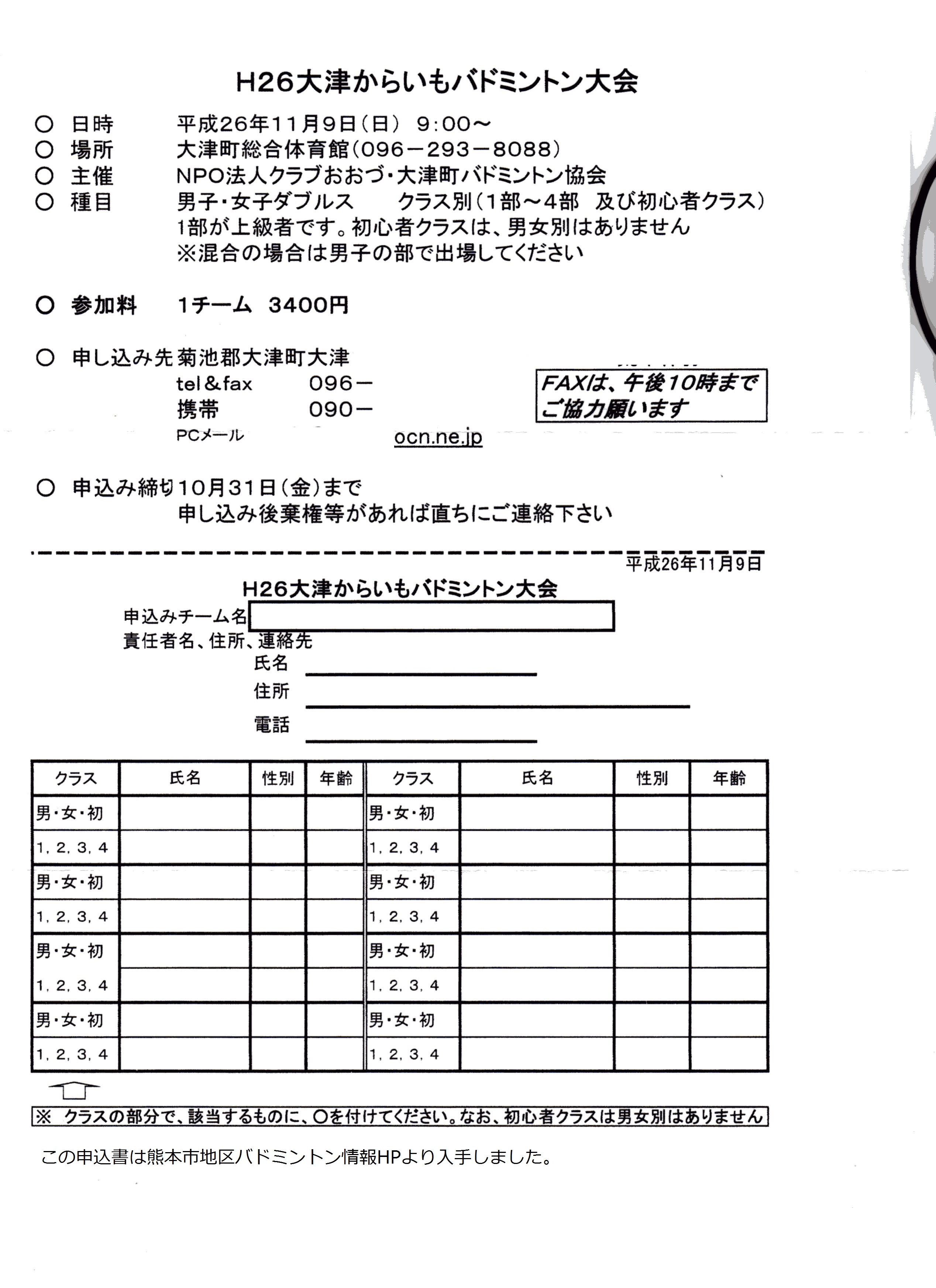 日時:平成26年11月9日(日) 9:00~会場:大津町総合体育館種別:男女別ランク別ダブルス個人戦種目:男女別 1、2,3,4部,初心者の部競技方法:リーグ戦かトーナメントかは要項に記載ありませんが、おそらくリーグ戦と思われます。参加料:1組3400円 参加賞あり(からいも) 他お楽しみ抽選あり締め切り:平成26年10月31日(金) FAXは午後10時まで申込先:本HPトップページの問い合わせボタンから本HP管理人宛に問い合わせ下さい。折り返し申込先を連絡致します。