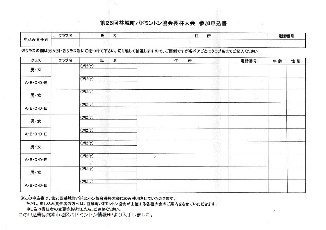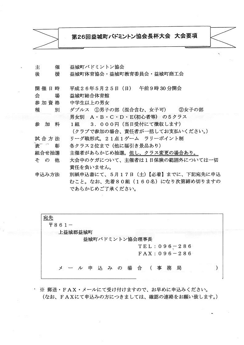 日時:平成26年5月25日(日) 9:30~会場:益城町総合体育館種別:男女別ランク別ダブルス個人戦種目:男女別 A・B・C・D・E(初心者)クラス 混合、女子は男子の部に参加可参加資格:中学生以上競技方法:リーグ戦 21点ラリーポイント制 参加料:1組3000円 福引き景品あり締め切り:平成26年5月17日(土) 先着80組で締め切り申込先:本HPトップページの問い合わせボタンから本HP管理人宛に問い合わせ下さい。折り返し申込先を連絡致します。