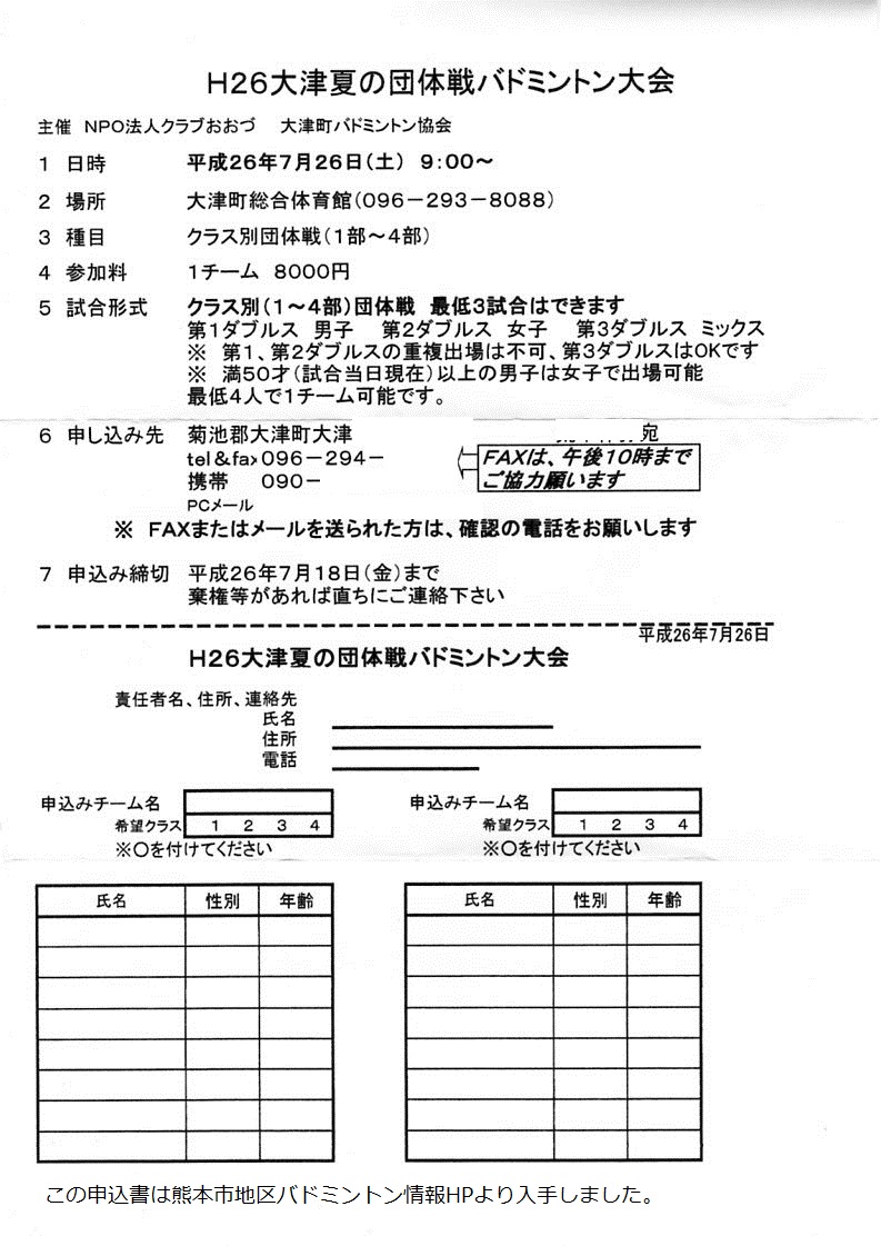 参加資格:チーム編成は自由(誰でも参加可) チームのランクを付けて申し込む。 1チーム4~6人(ミックスは男子または女子ダブルスと重複出場可)