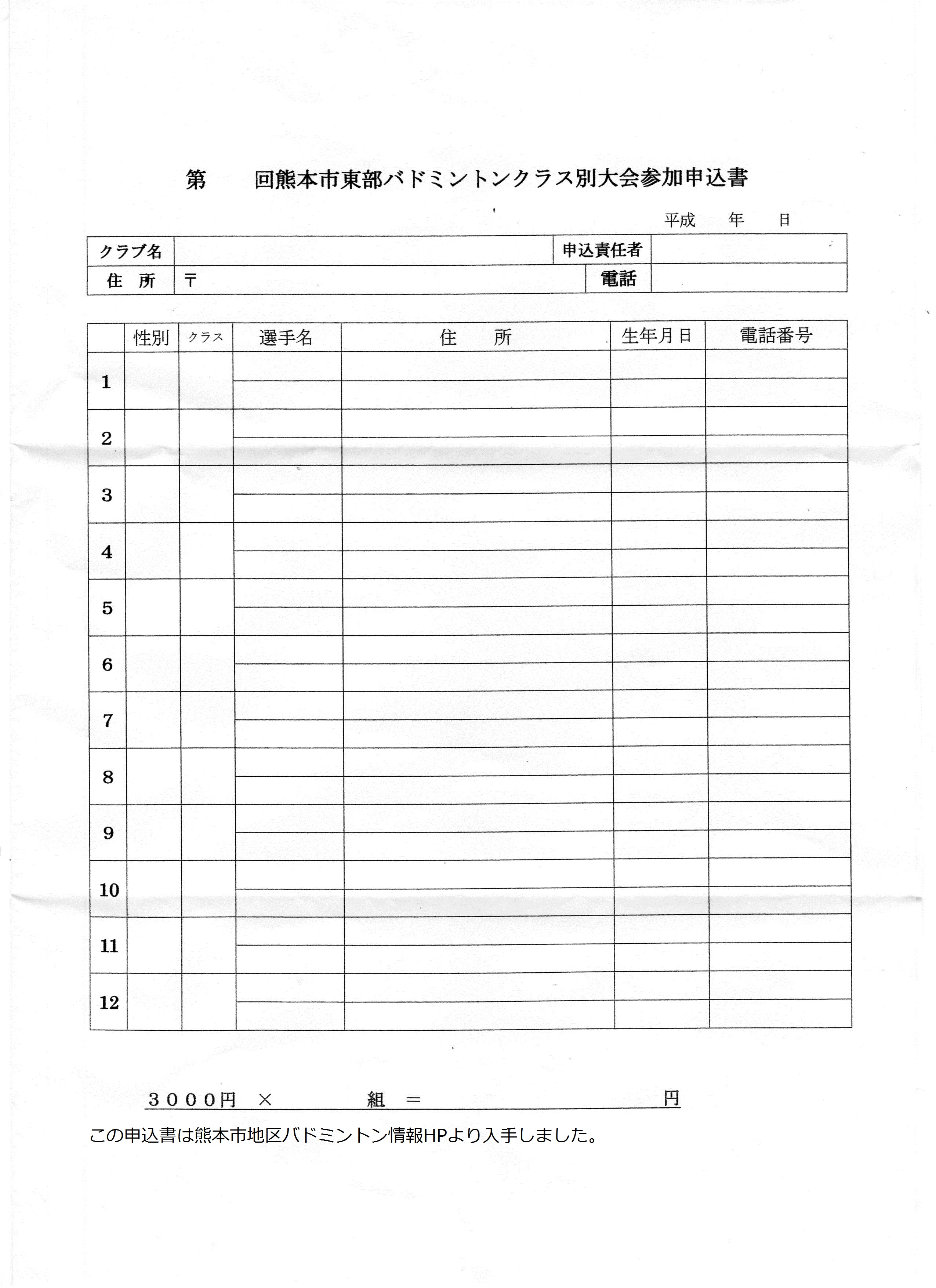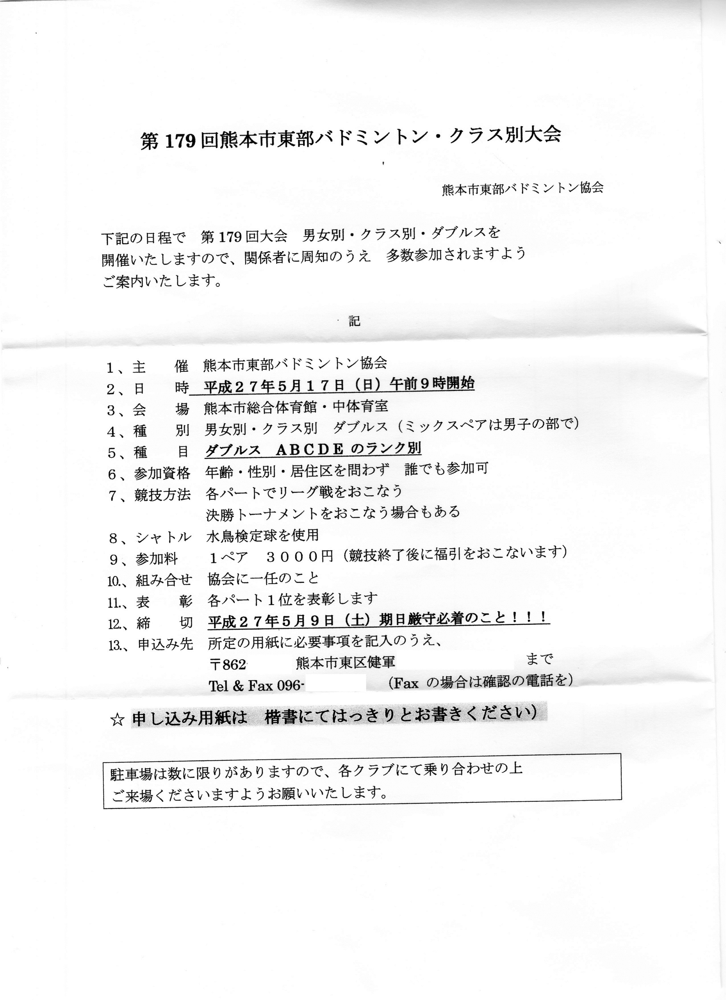 日時:平成27年5月17日(日) 9:00~会場:熊本市総合体育館 中体育室種別:男女別ダブルス個人戦種目:男女別 クラス(A,B,C,D,E)別参加資格:誰でも可 年齢、居住区を問わない。競技方法:リーグ戦表彰:優勝チームを表彰。参加料:1チーム3000円 (福引き有り)締め切り:平成27年5月9日(土)必着申込先:本HPトップページの問い合わせボタンより本HP管理人宛に問い合わせ下さい。折り返し申込先を連絡致します。