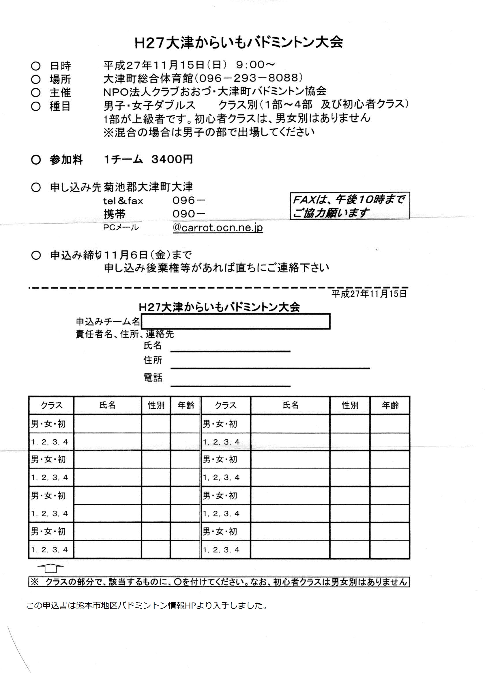日時:平成27年11月15日(日) 9:00~会場:大津町総合体育館種別:男女別ランク別ダブルス個人戦種目:男女別 1、2,3,4部,初心者の部競技方法:リーグ戦かトーナメントかは要項に記載ありませんが、おそらくリーグ戦と思われます。参加料:1組3400円 参加賞あり(からいも) 他お楽しみ抽選あり締め切り:平成27年11月6日(金) FAXは午後10時まで申込先:本HPトップページの問い合わせボタンから本HP管理人宛に問い合わせ下さい。折り返し申込先を連絡致します。