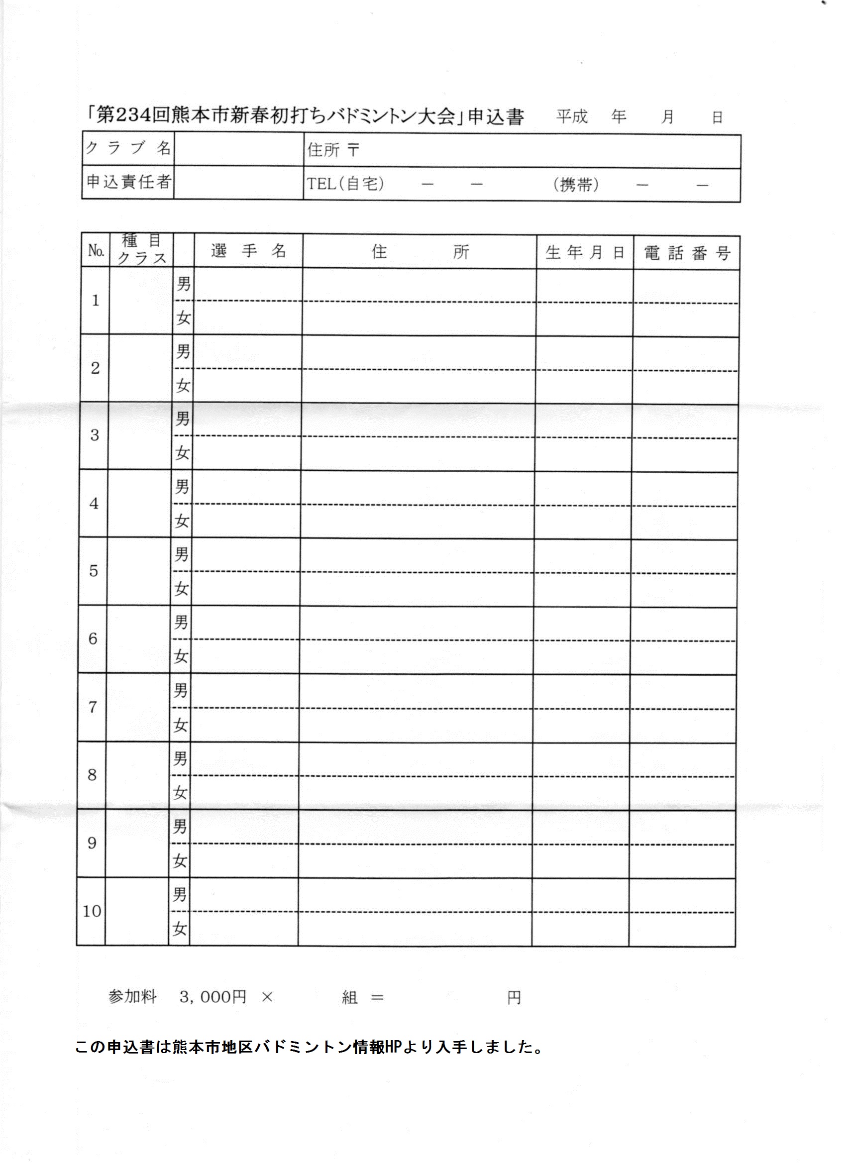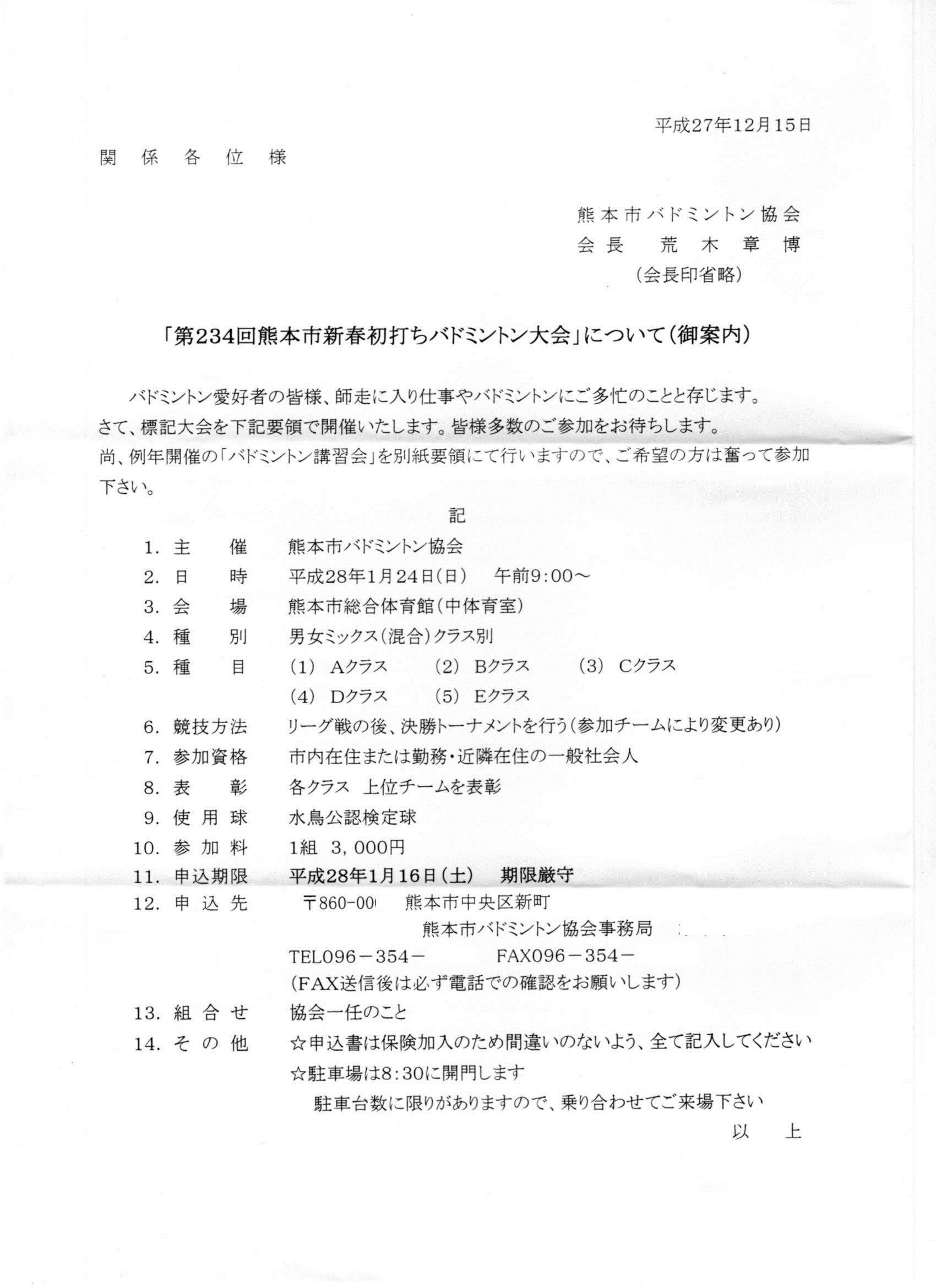 日時:平成28年1月25日(日) 9:00~会場:熊本市総合体育館 中体育室種別:男女ミックスダブルス クラス別種目:A,B.C.D,Eクラス競技方法:リーグ戦参加資格:熊本市内または近郊在住または勤務の方参加料:1組3000円締切:平成28年1月16日(土)その他:駐車場が少ないので乗り合わせをお願いします。 申し込み先:本HPのトップページの問い合わせボタンより、本HP管理人宛に問い合わせください。折り返し申し込み先を連絡いたします。