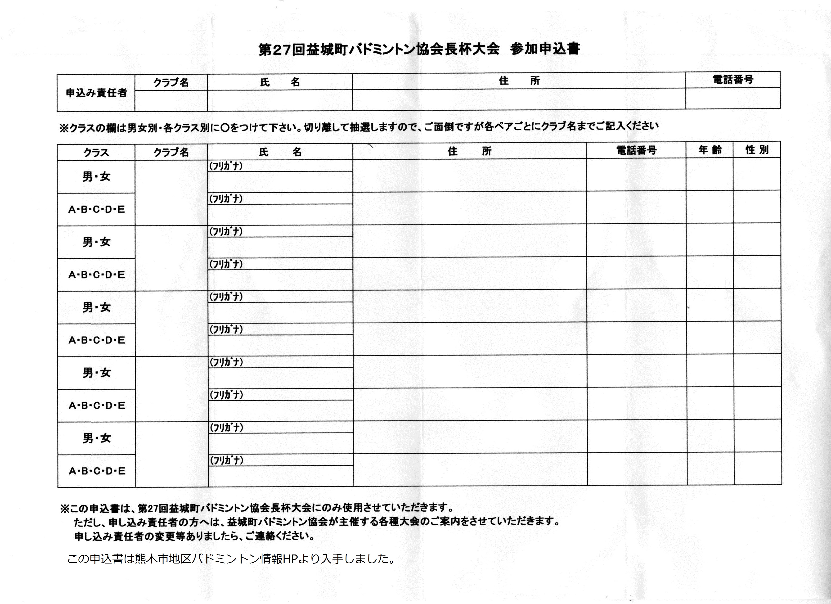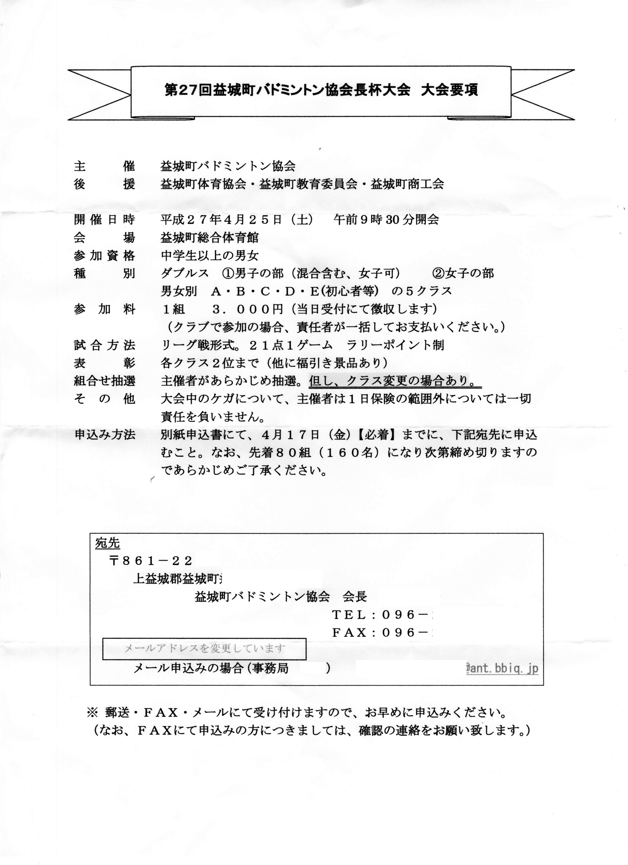 日時:平成27年4月25日(土) 9:30~会場:益城町総合体育館種別:男女別ランク別ダブルス個人戦種目:男女別 A・B・C・D・E(初心者)クラス 混合、女子は男子の部に参加可参加資格:中学生以上競技方法:リーグ戦 21点ラリーポイント制 参加料:1組3000円 福引き景品あり締め切り:平成27年4月17日(金) 先着80組で締め切り申込先:本HPトップページの問い合わせボタンから本HP管理人宛に問い合わせ下さい。折り返し申込先を連絡致します。