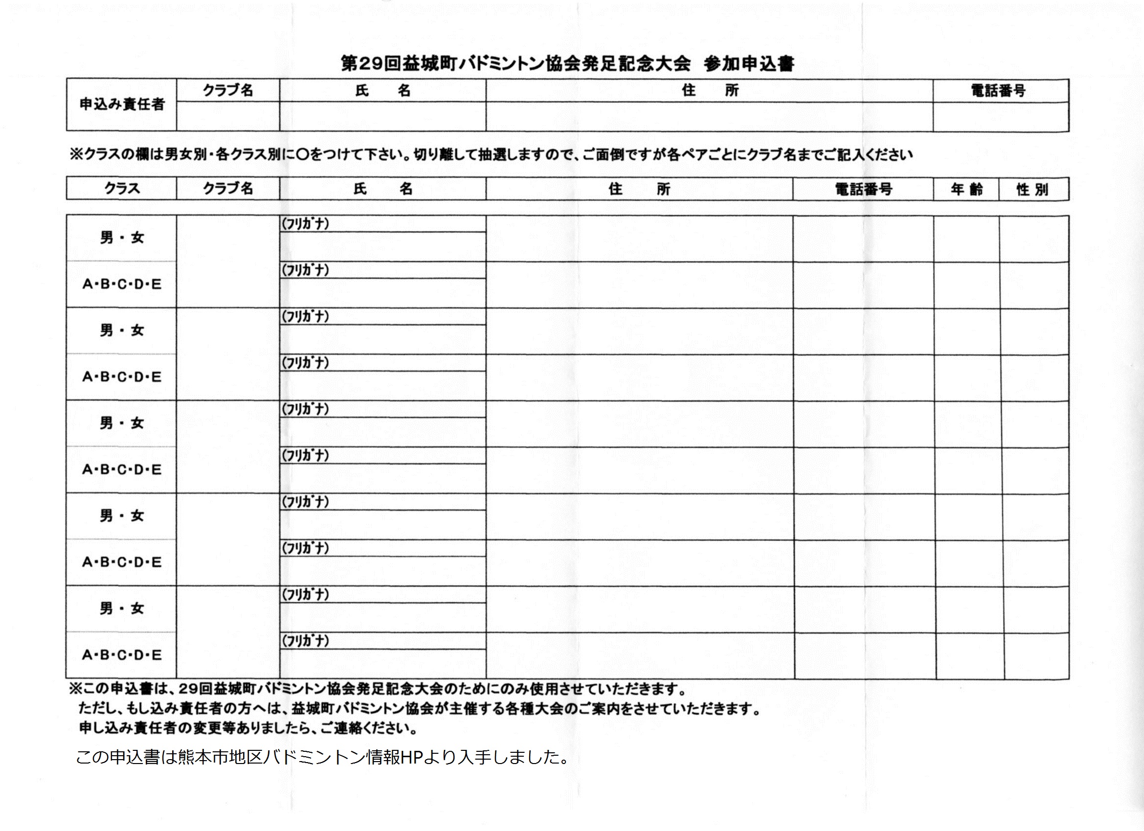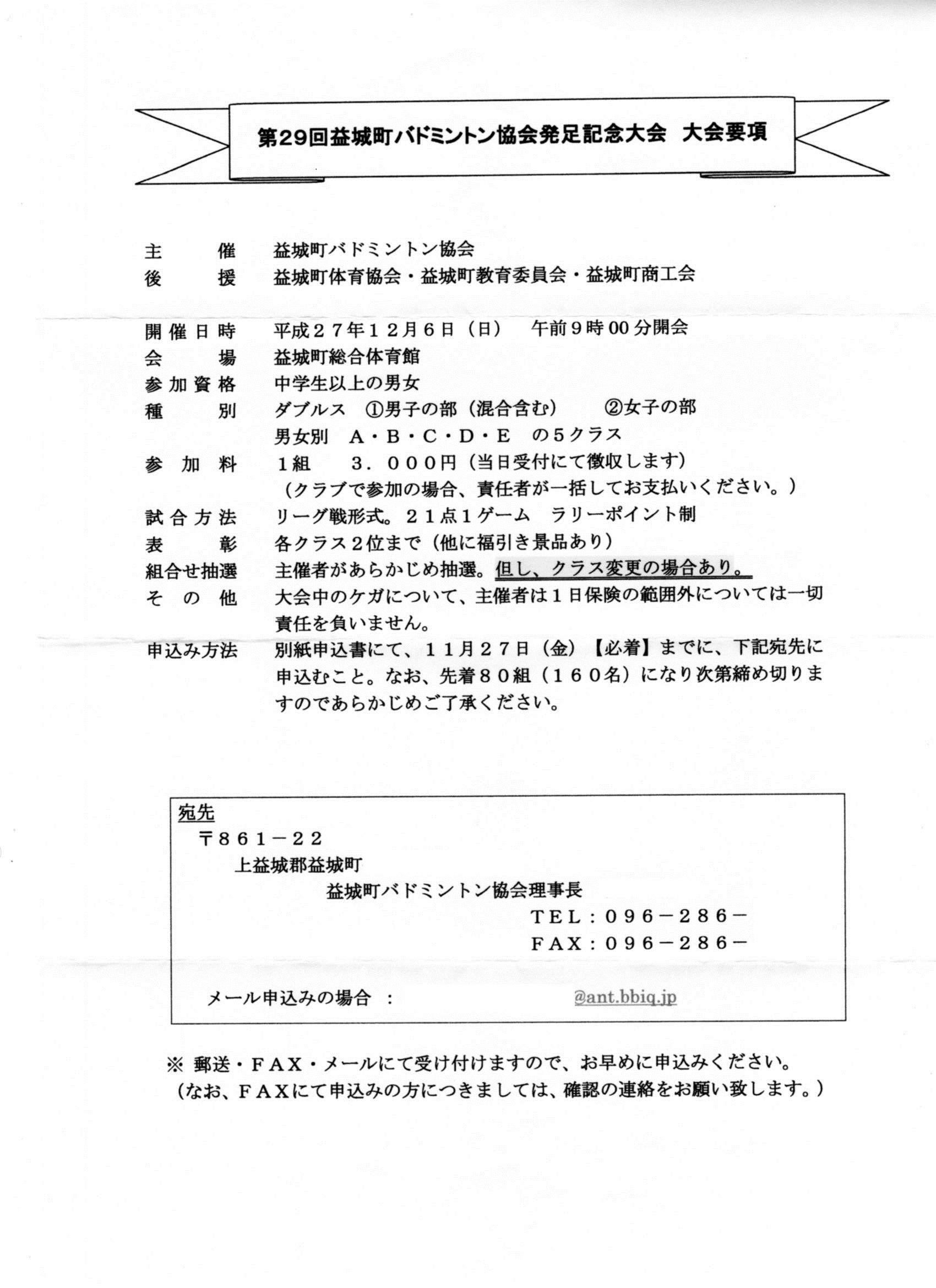 日時:平成27年12月6日(日) 9:00~会場:益城町総合体育館種別:男女別ランク別ダブルス個人戦種目:男女別 A・B・C・D・Eクラス 混合および女子ペアは男子の部に参加可参加資格:中学生以上競技方法:リーグ戦 21点ラリーポイント制 参加料:1組3000円 福引き景品あり締め切り:平成27年11月27日(金) 先着80組で締め切り申込先:本HPトップページの問い合わせボタンから本HP管理人宛に問い合わせ下さい。折り返し申込先を連絡致します。