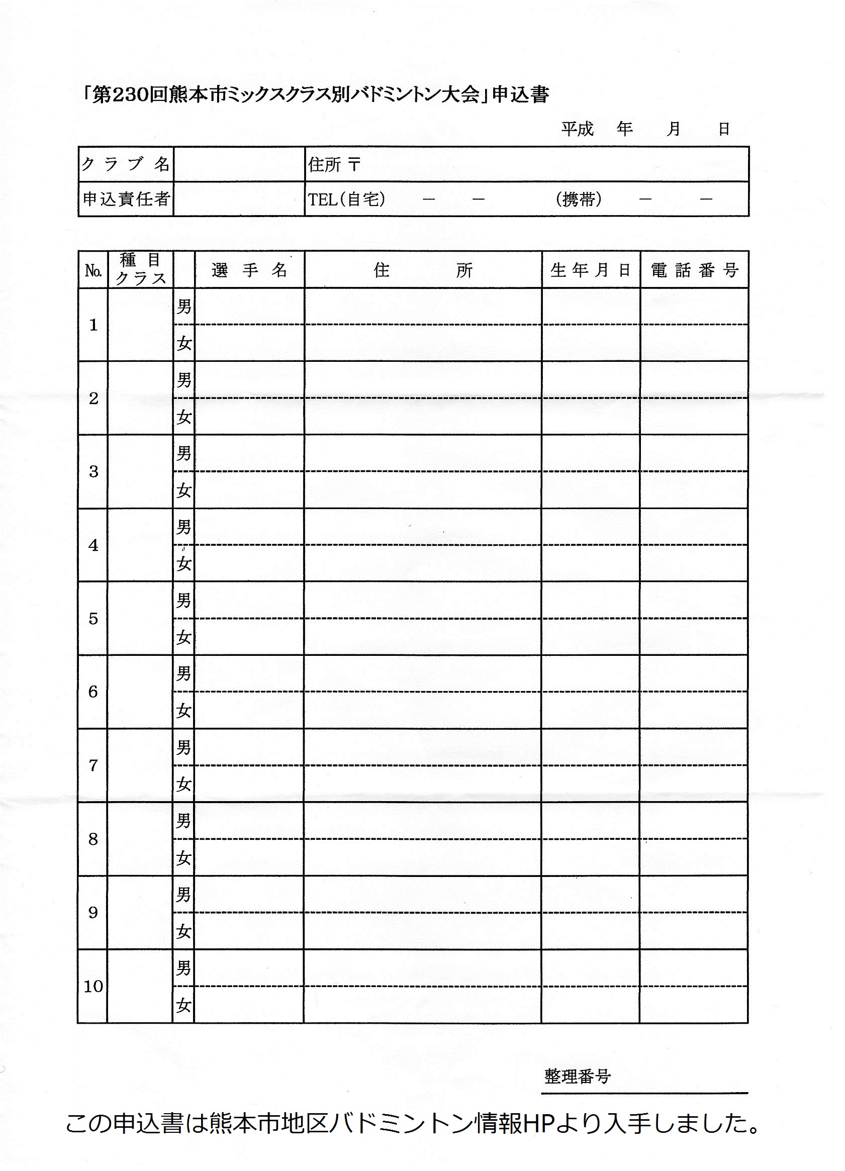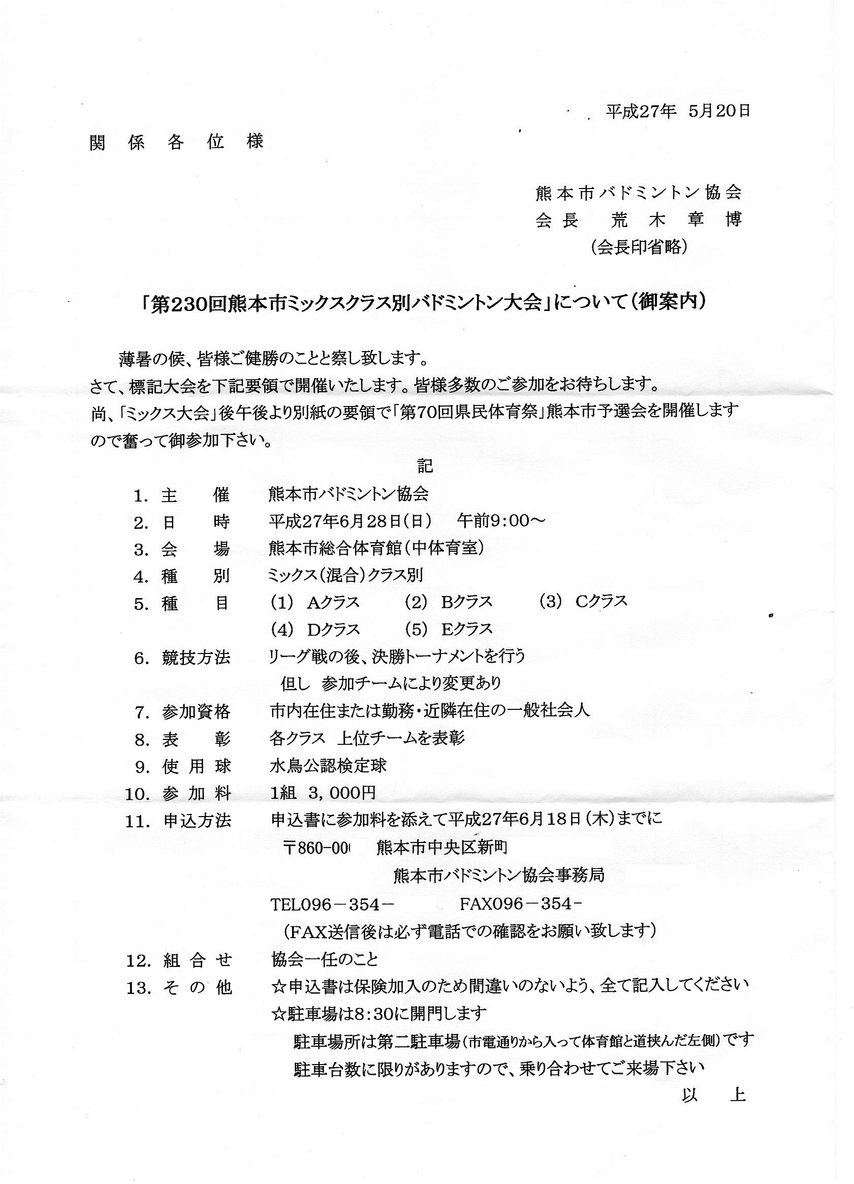 日時:平成27年6月28日(日) 9:00~会場:熊本市総合体育館 中体育室種別:ミックスダブルス個人戦(A,B,C,D,E)種目:クラス別競技方法:リーグ戦参加資格:市内又は市内周辺在住・勤務の方参加料:1チーム3000円 締め切り:平成27年6月18日(木)必着申込先:本HPトップページの問い合わせボタンより本HP管理人宛に問い合わせ下さい。折り返し申込先を連絡致します。