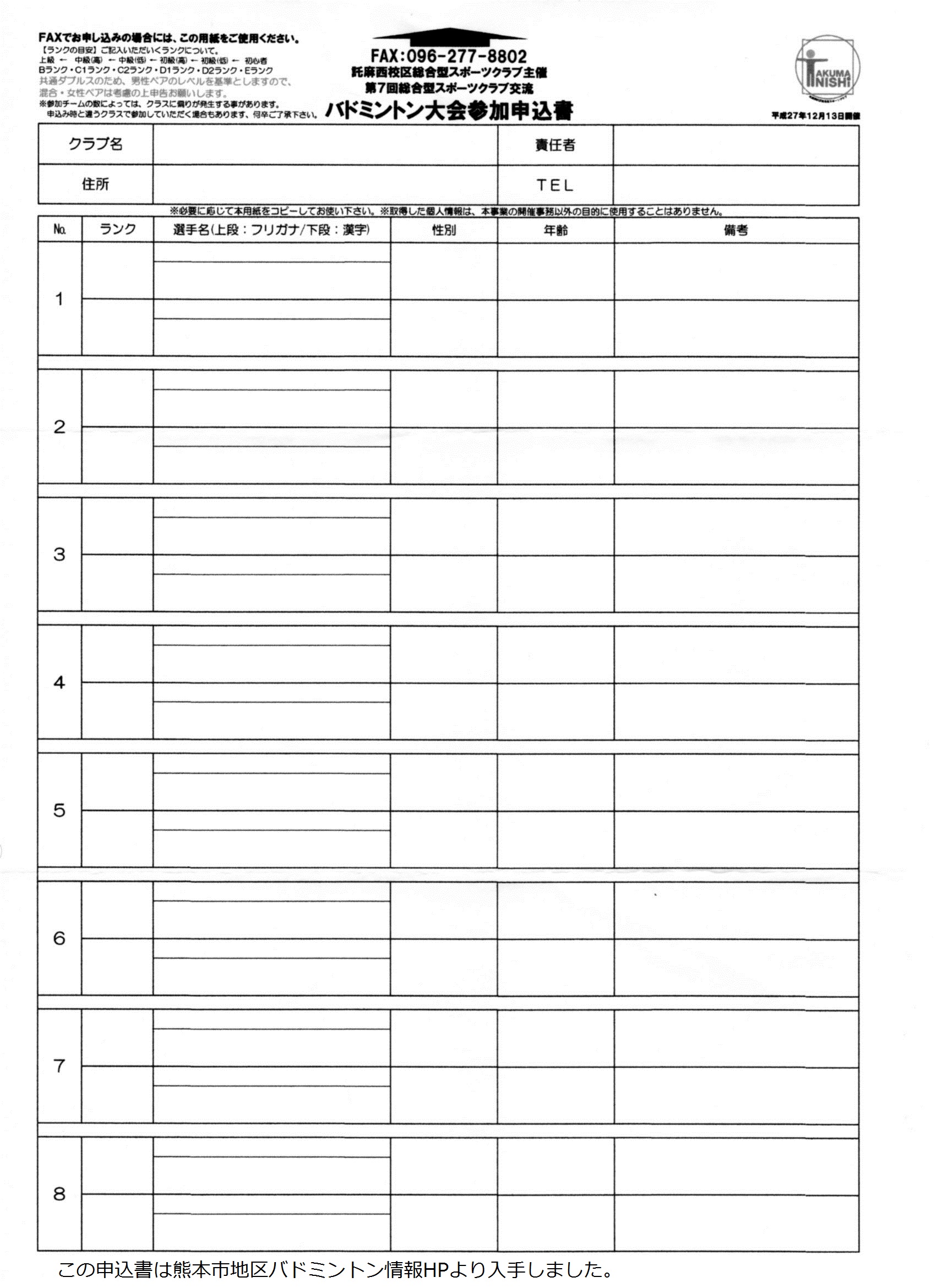 日時:平成27年12月13日(日) 9:00~会場:託麻スポーツセンター種別:男女共通ダブルス個人戦種目:A・B・C1,C2,D1,D2,Eクラス(Eは初心者)競技方法:リーグ戦 21点ラリーポイント制 参加料:1組2000円 (軽食ありません)締め切り:平成27年12月5日(土) 申込先:託麻西校区総合型スポーツクラブ事務局(添付している要項に記載されています。)