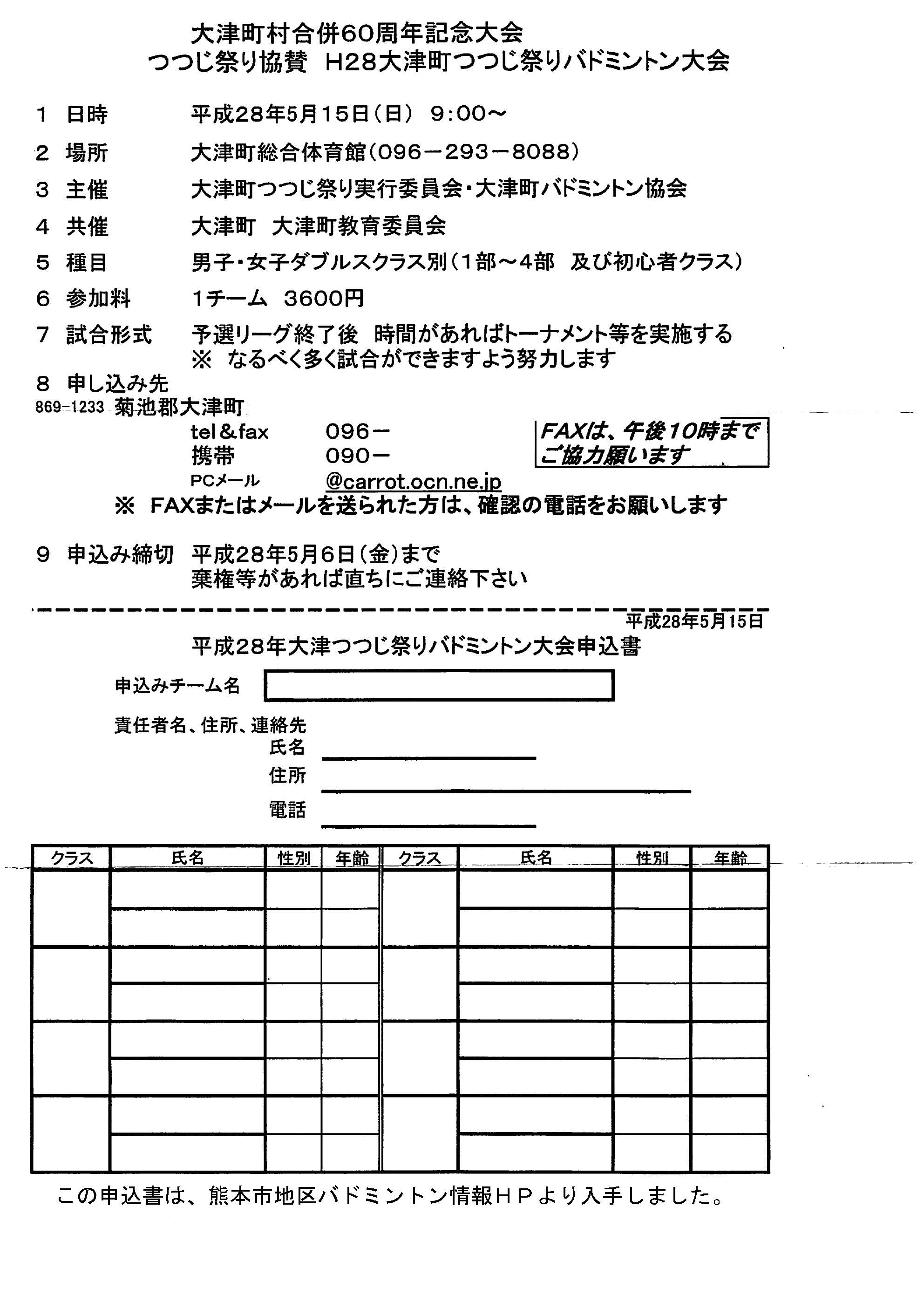 日時:平成28年5月15日(日) 9:00~会場:大津町総合体育館種別:男女別ランク別ダブルス個人戦種目:男女別 1、2,3,4部,初心者の部時間あれば決勝トーナメントあり参加料:1組3600円 締め切り:平成28年5月6日(金)その他:fax等は午後10時まで 申込先:本HPトップページの問い合わせボタンから本HP管理人宛に問い合わせ下さい。折り返し申込先を連絡致します。