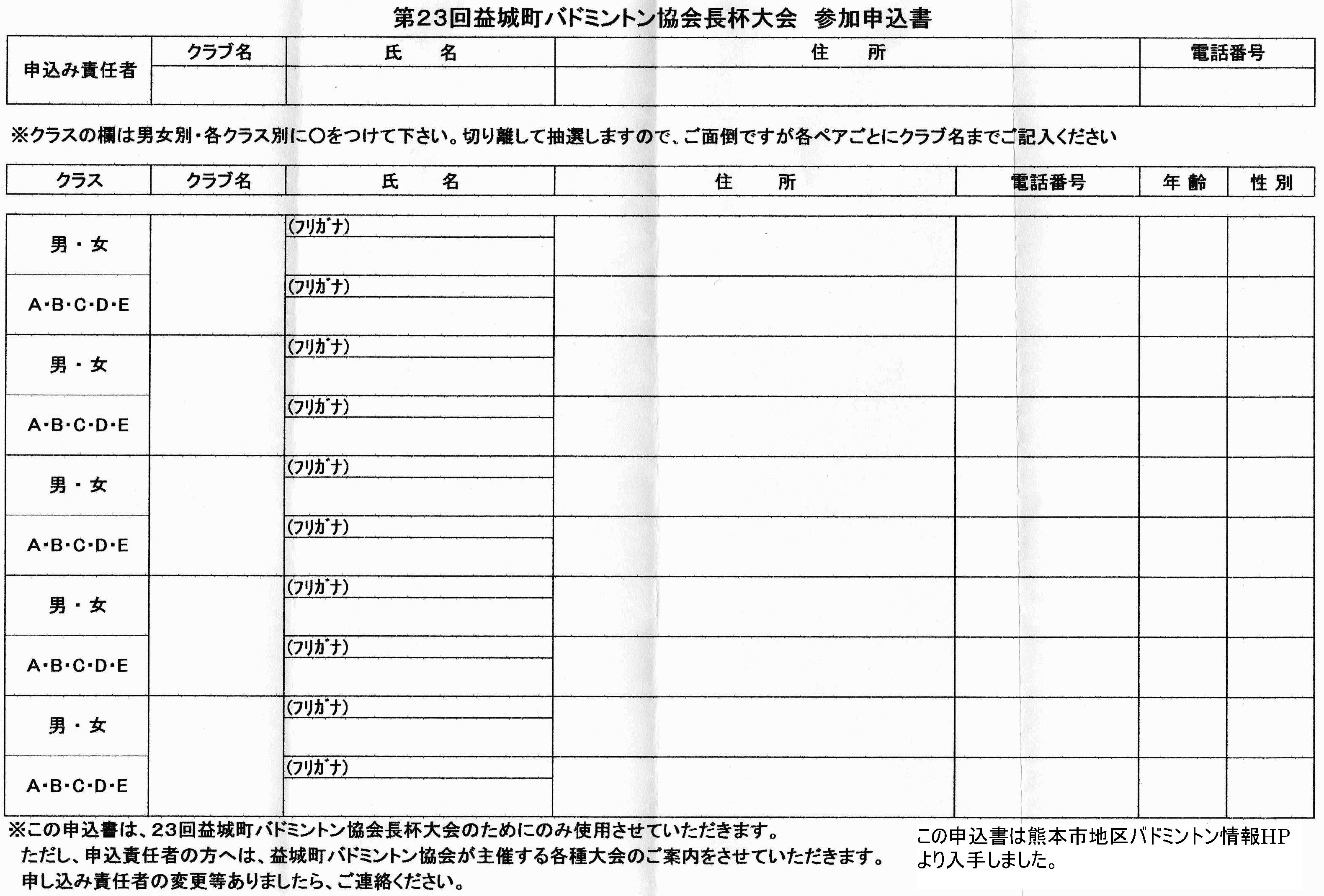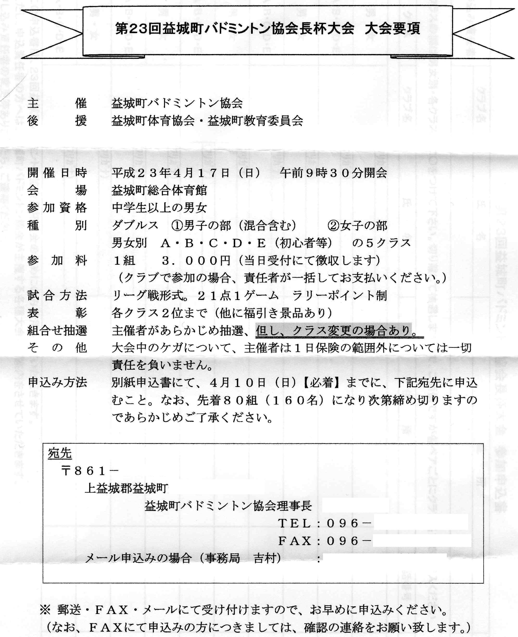 第23回益城町バドミントン協会長杯大会日時:平成23年4月17日(日) 9:30~会場:益城町総合体育館種別:男女別ダブルス個人戦種目:男女別 クラス(A,B,C,D,E)別参加資格:中学生以上競技方法:リーグ戦表彰:優勝チームを表彰。(全チームに参加賞あり)参加料:1チーム3000円 (福引き有り)締め切り:平成23年4月10日(金)必着申込先:本HPトップページの問い合わせボタンより本HP管理人宛に問い合わせ下さい。折り返し申込先を連絡致します。