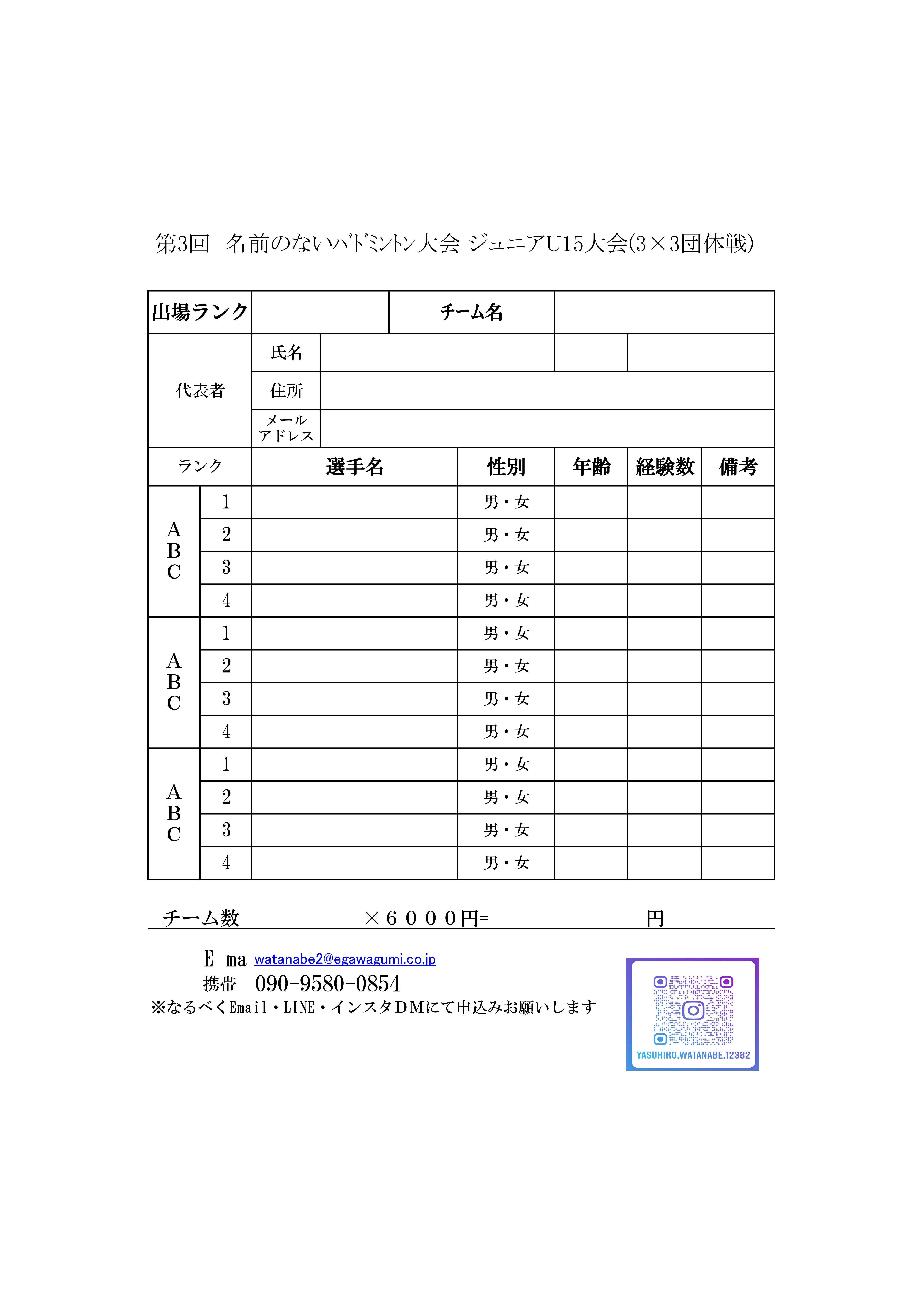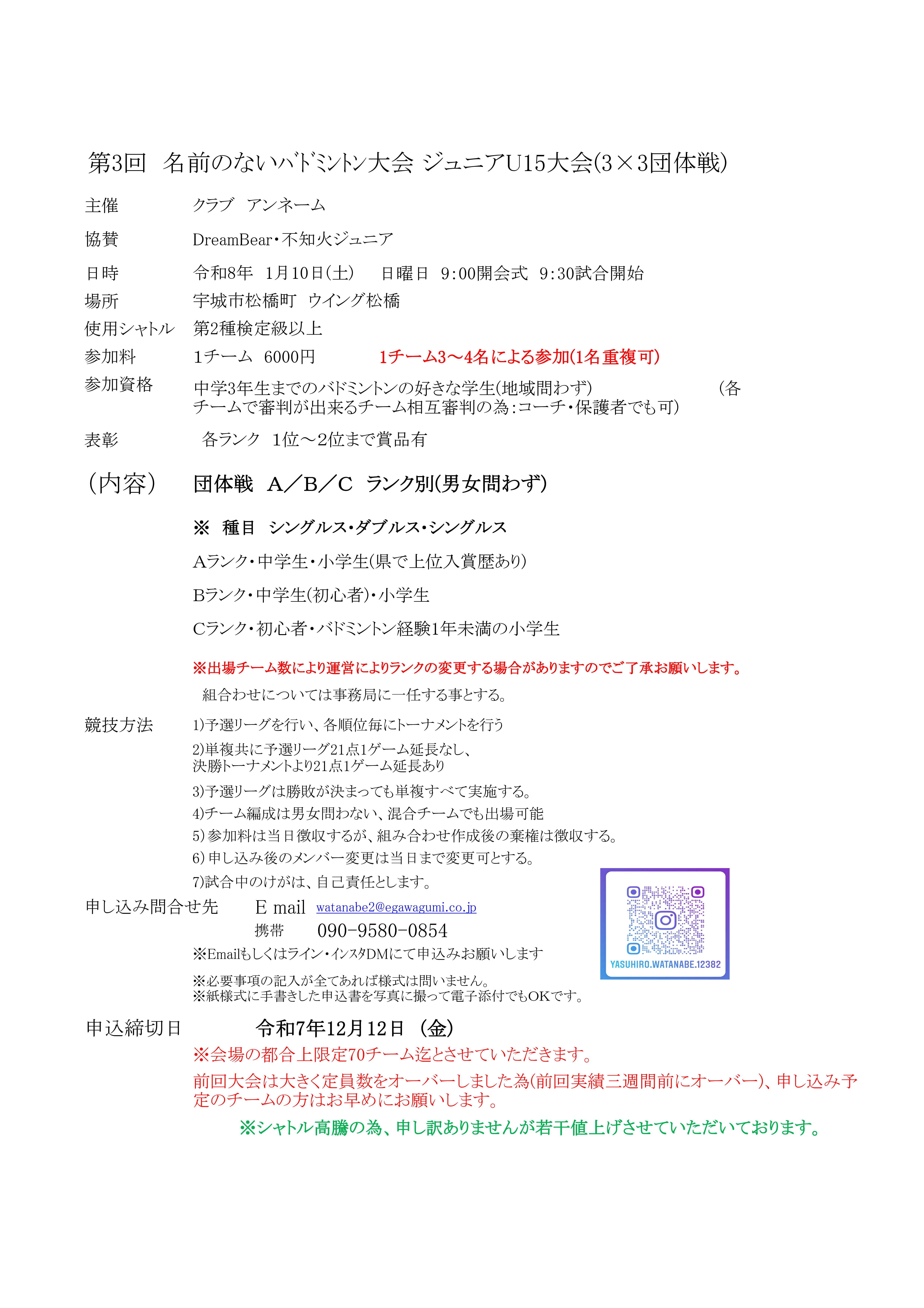 第3回 名前のないバドミントン大会 ジュニアU15大会(3×3団体戦)