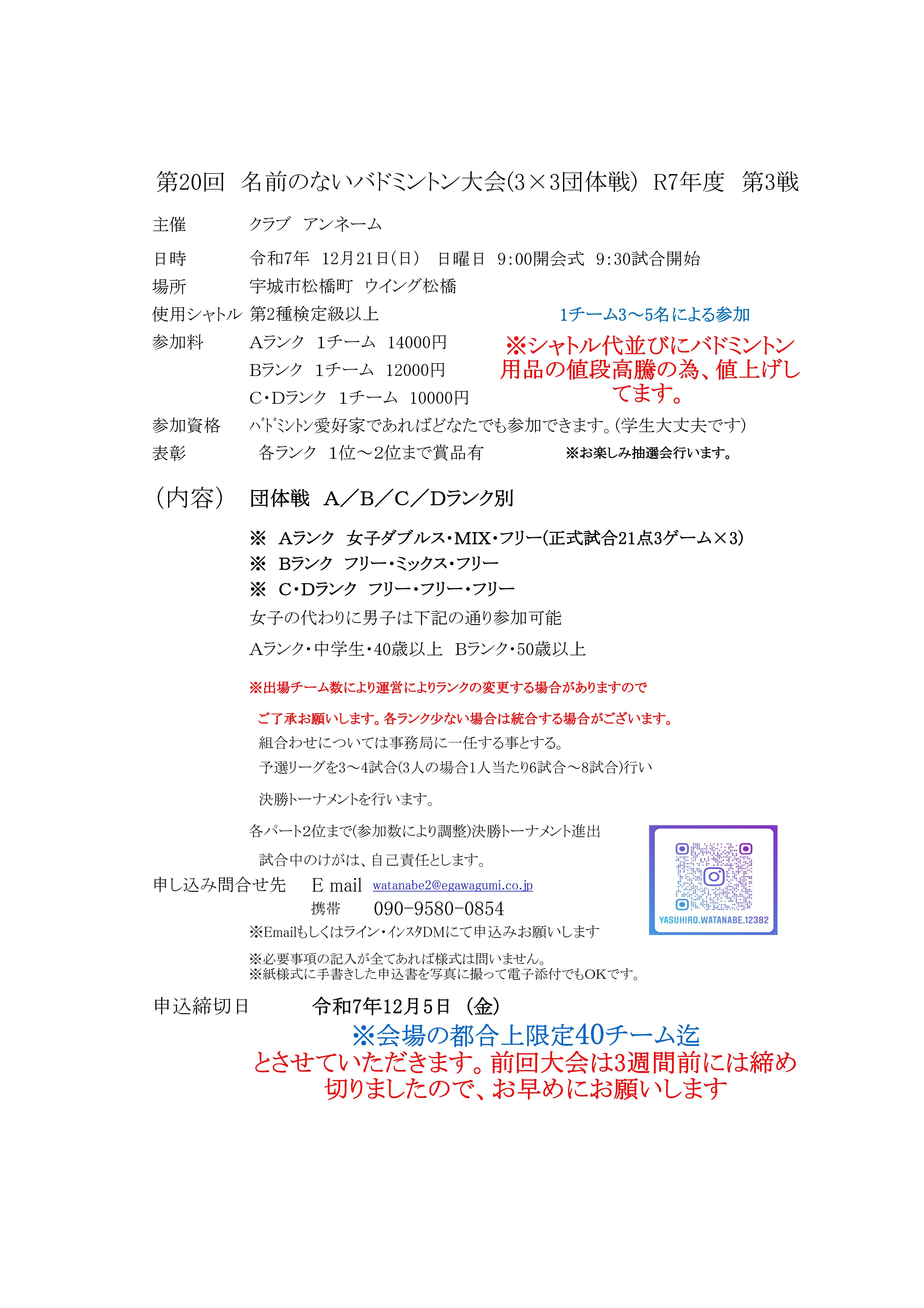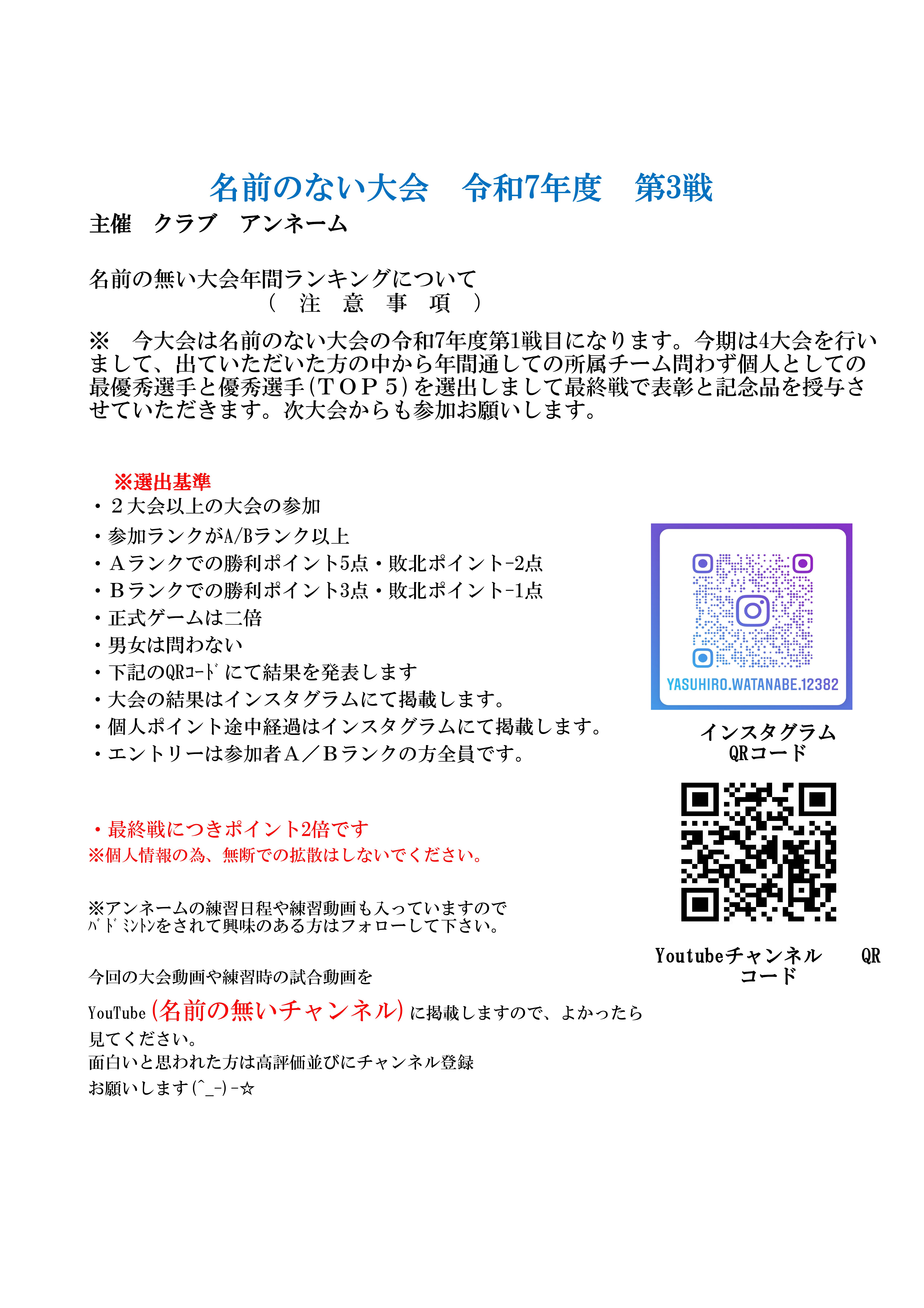 第20回 名前のないバドミントン大会(3×3団体戦) R7年度 第3戦