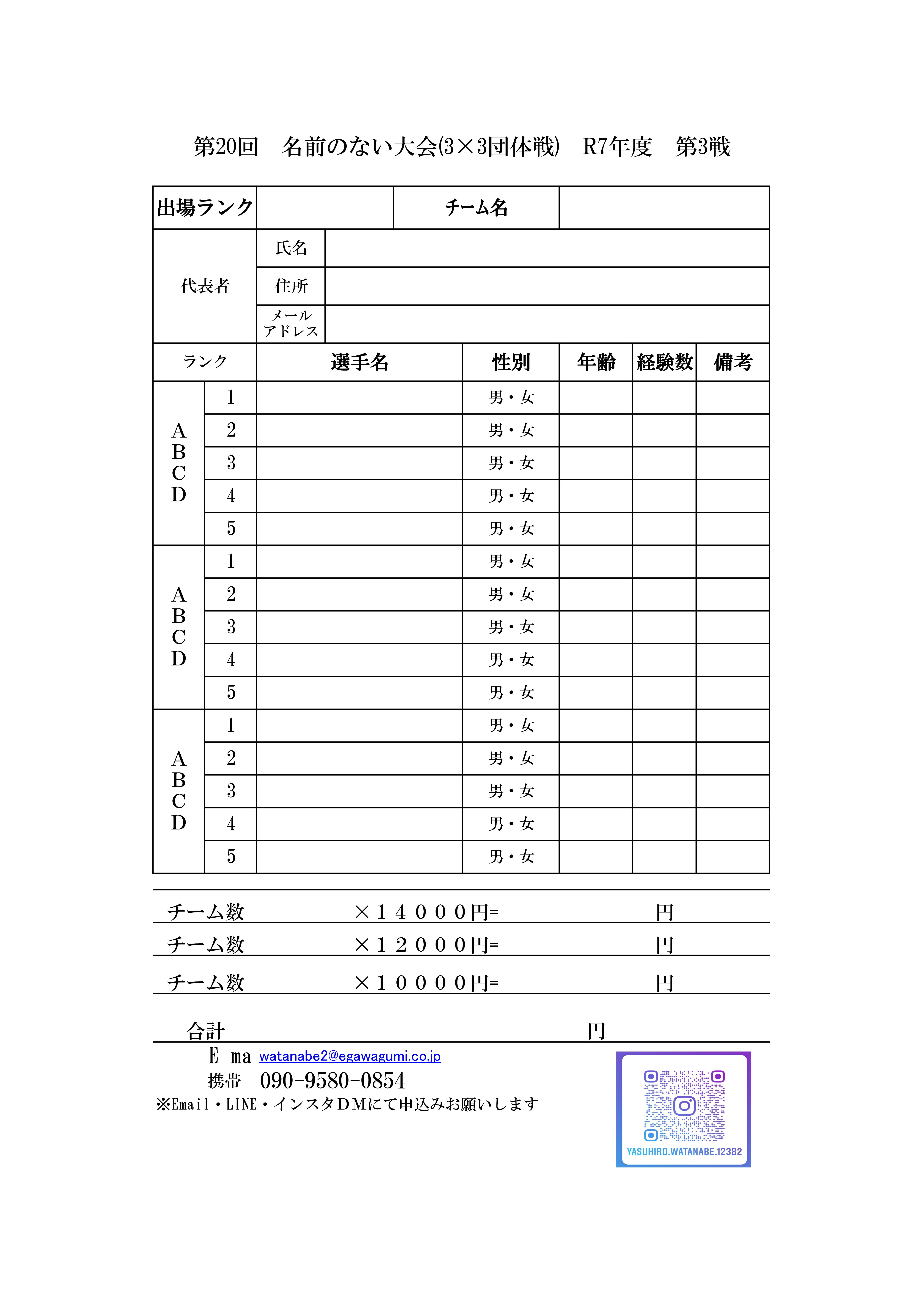 ※会場の都合上限定40チーム迄 とさせていただきます。前回大会は3週間前には締め切りましたので、お早めにお願いします