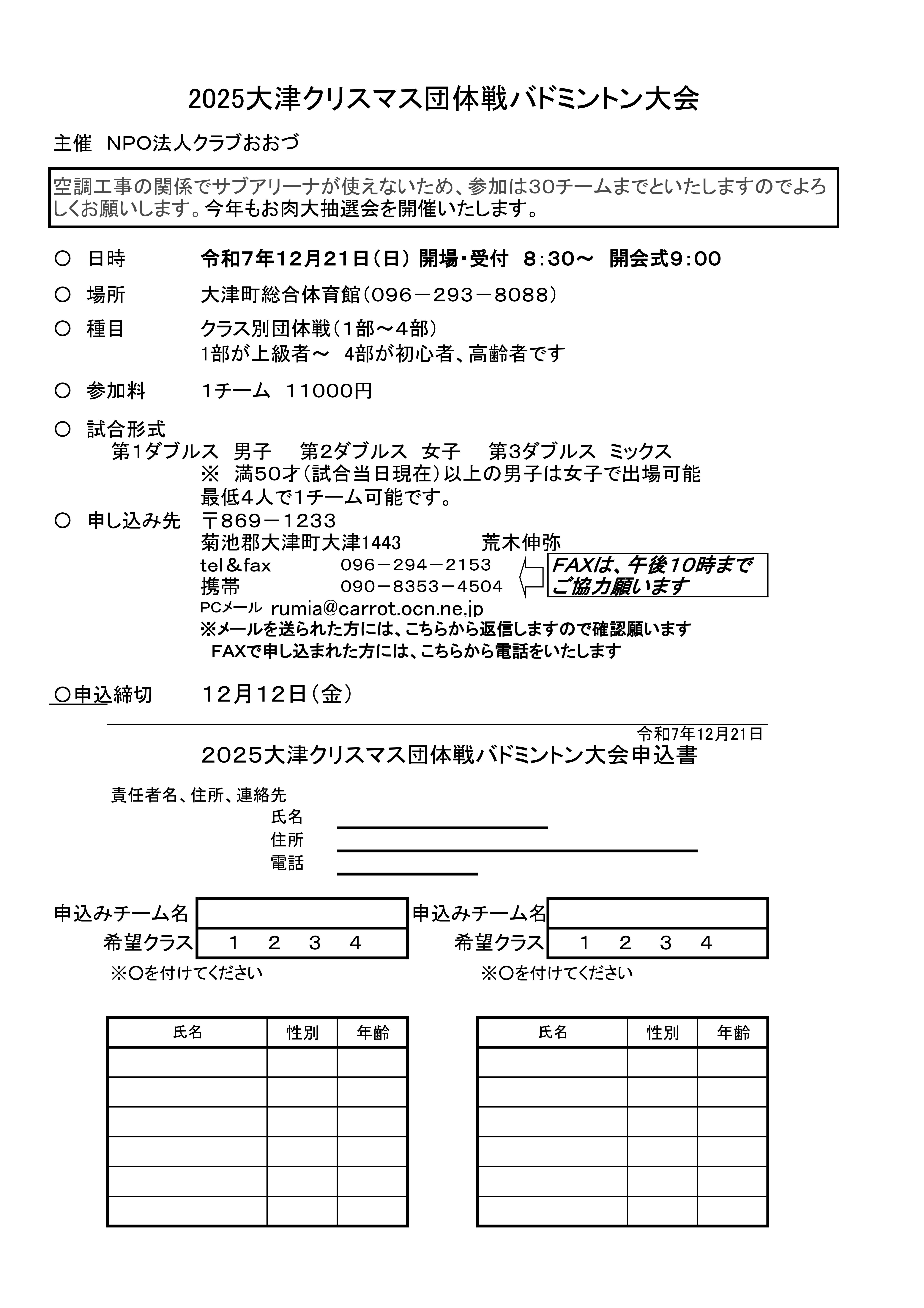 空調工事の関係でサブアリーナが使えないため、参加は30チームまでといたしますのでよろしくお願いします。今年もお肉大抽選会を開催いたします。
