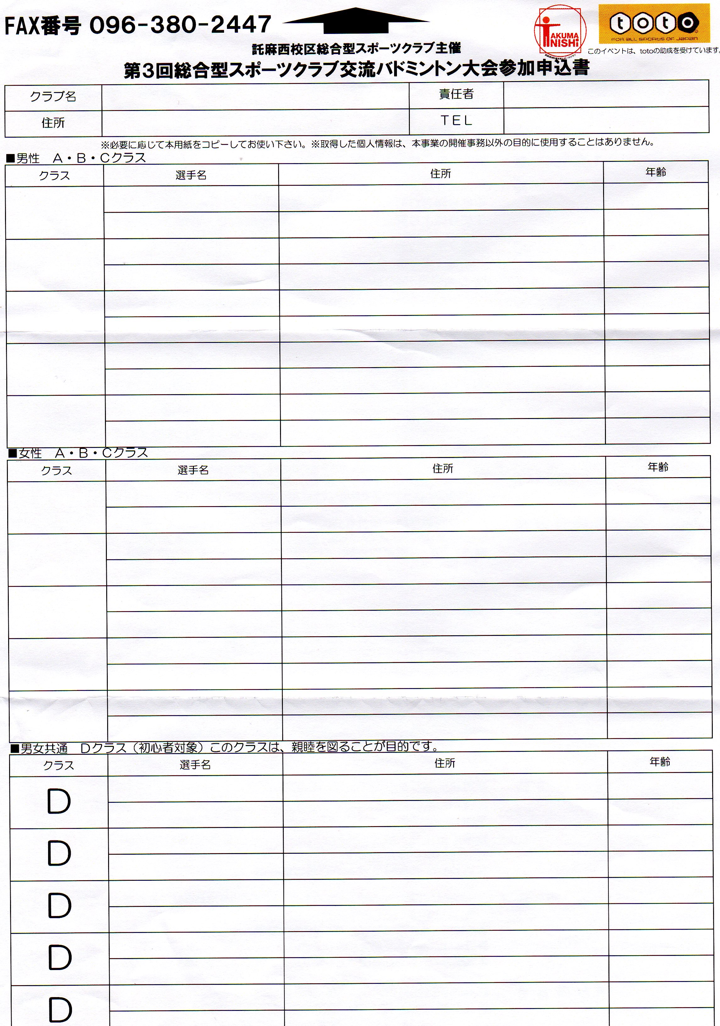 種目:男女別 A,B.Cクラス、初心者クラス(Dクラス=男女共通クラス)