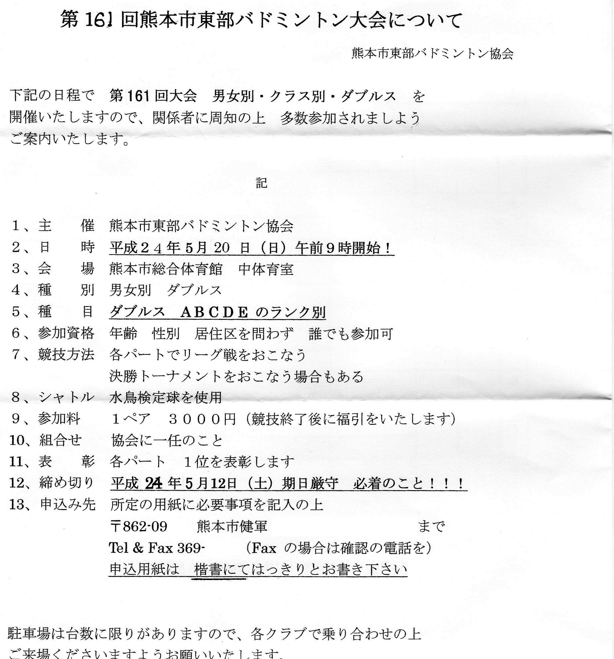 日時:平成24年5月20日(日) 9:00~会場:熊本市総合体育館 中体育室種別:男女別ダブルス個人戦種目:男女別 クラス(A,B,C,D,E)別参加資格:誰でも可 年齢、居住区を問わない。競技方法:リーグ戦表彰:優勝チームを表彰。参加料:1チーム3000円 (福引き有り)締め切り:平成24年5月12日(土)必着申込先:本HPトップページの問い合わせボタンより本HP管理人宛に問い合わせ下さい。折り返し申込先を連絡致します。