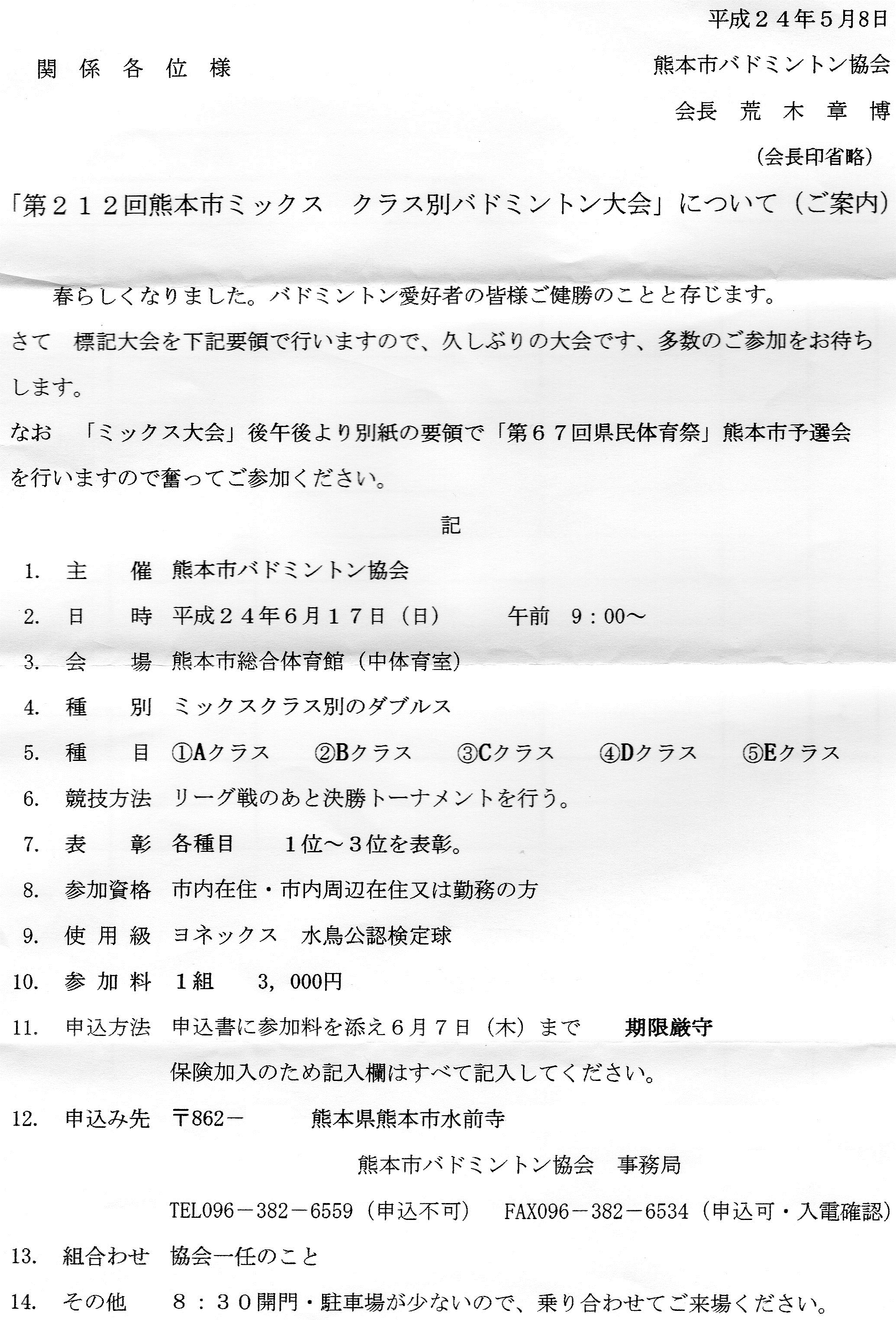 日時:平成24年6月17日(日) 9:00~会場:熊本市総合体育館 中体育室種別:ミックスダブルス個人戦(A,B,C,D,E)種目:クラス別競技方法:リーグ戦参加資格:市内又は市内周辺在住・勤務の方参加料:1チーム3000円 締め切り:平成24年6月7日(木)必着申込先:本HPトップページの問い合わせボタンより本HP管理人宛に問い合わせ下さい。折り返し申込先を連絡致します。