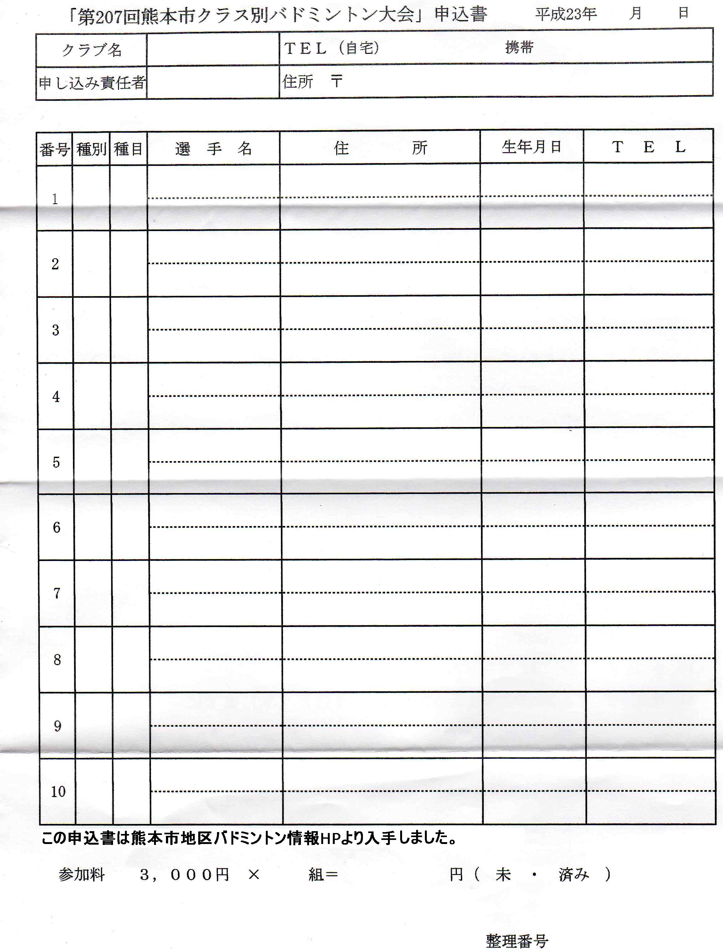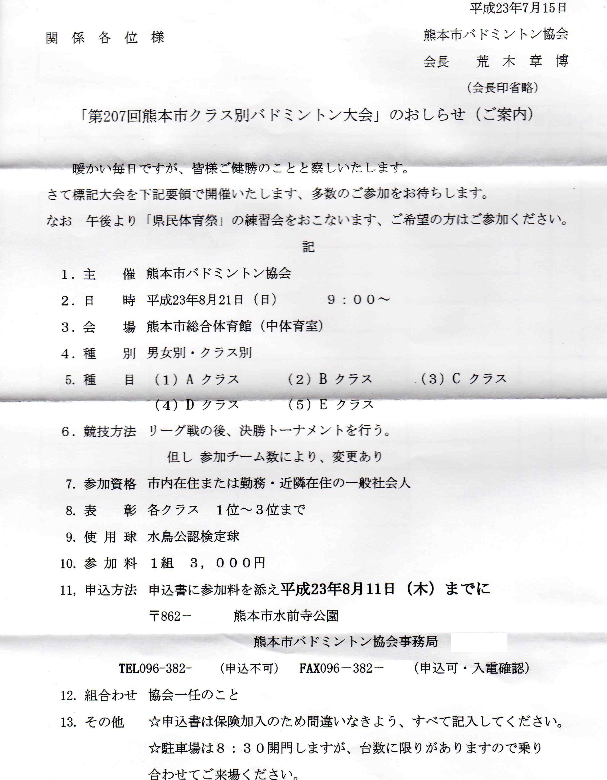 日時:平成23年8月21日(日) 9:00~会場:熊本市総合体育館 中体育室種別:男女別ダブルス個人戦 男子(A,B,C,D,E) 女子(A,B,C,D,E)種目:男女別 クラス別競技方法:リーグ戦参加資格:市内又は市内周辺在住・勤務の方参加料:1チーム3000円 締め切り:平成23年7月11日(木)必着申込先:本HPトップページの問い合わせボタンより本HP管理人宛に問い合わせ下さい。折り返し申込先を連絡致します。