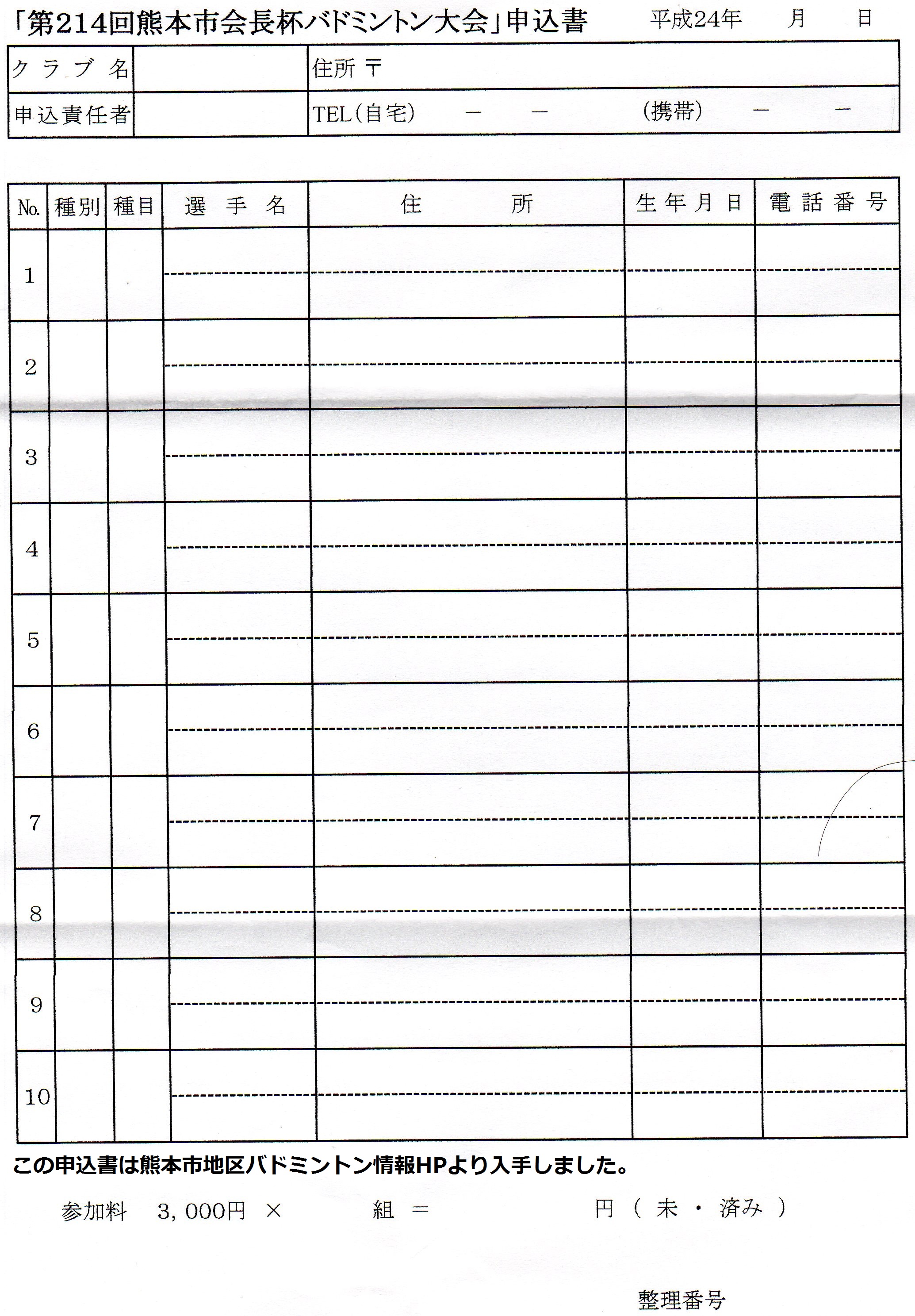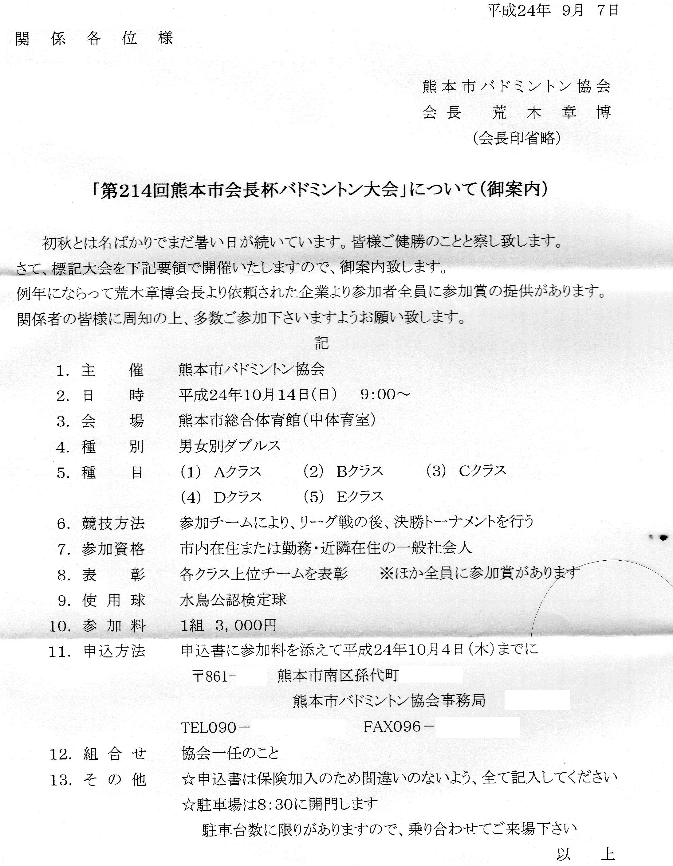 日時:平成24年10月14日(日) 9:00~会場:熊本市総合体育館 中体育室種別:男女別ダブルス個人戦 男子(A,B,C,D,E) 女子(A,B,C,D,E)種目:男女別 クラス別競技方法:リーグ戦参加資格:市内又は市内近隣在住・勤務の一般社会人参加料:1チーム3000円 (全員に参加賞あり)締め切り:平成24年10月4日(木)必着申込先:本HPトップページの問い合わせボタンより本HP管理人宛に問い合わせ下さい。折り返し申込先を連絡致します。